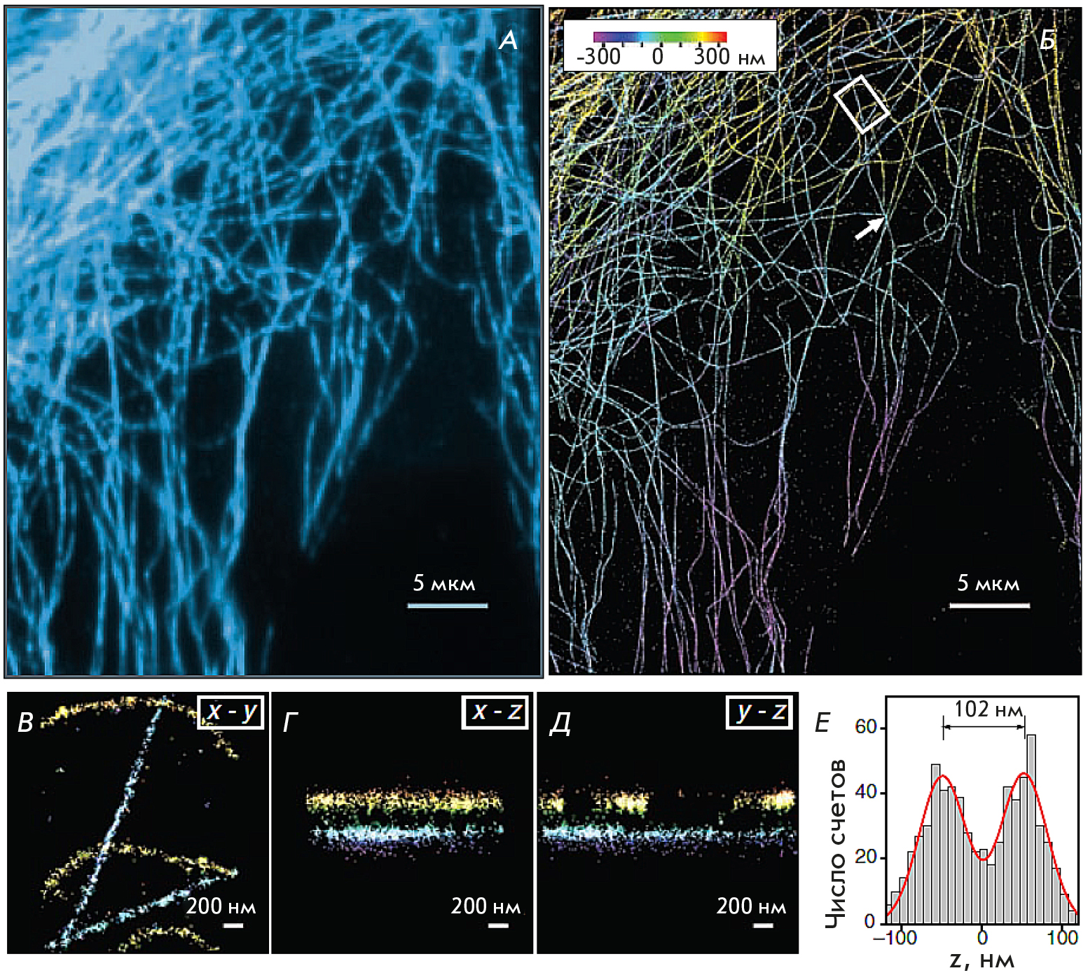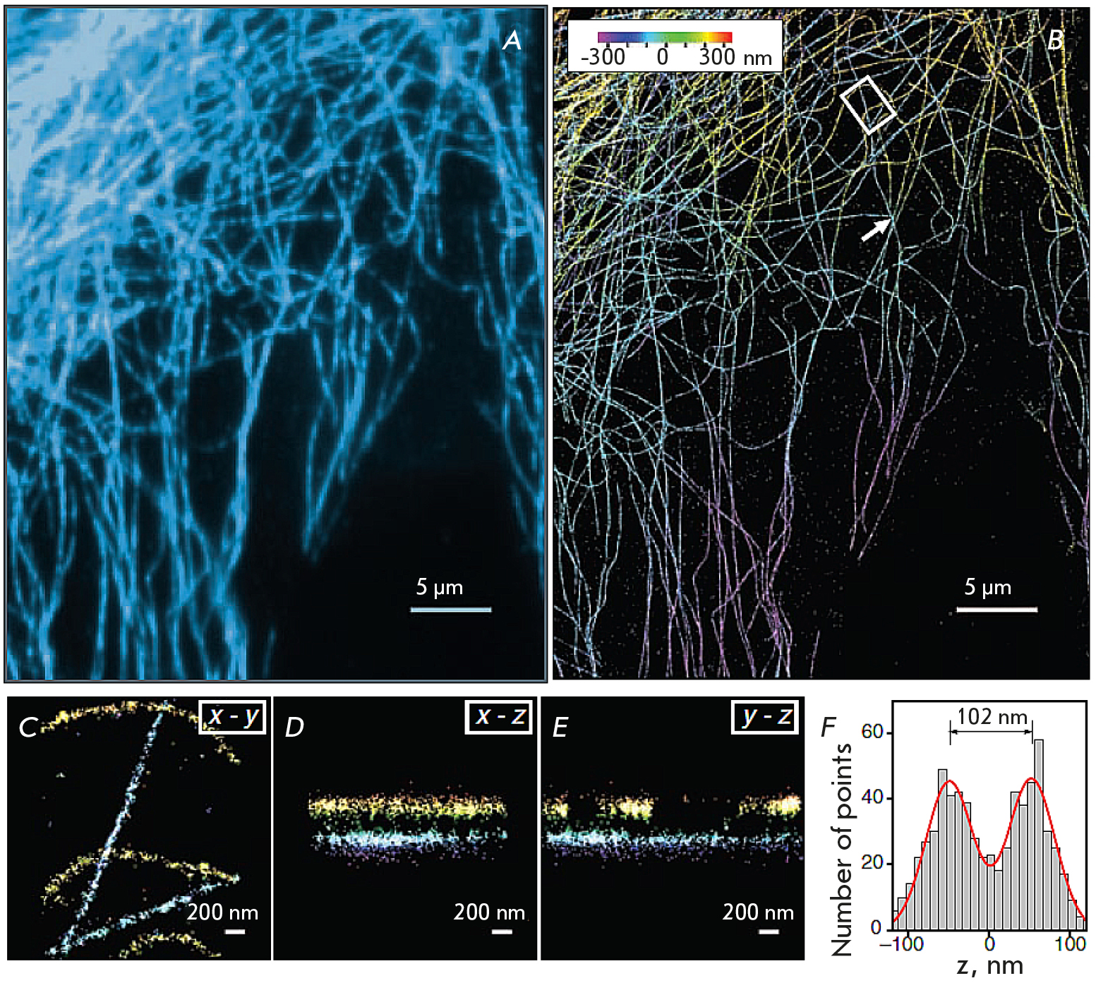 Fig. 7. Results obtained using the 3D STORM technique. (A) A widefield fluorescent image of microtubules in a BS-C-1 cell. (B) An image obtained in the 3D STORM mode of the same section of the BSC-1 cell as that shown in panel (A). Data on the axial coordinates of the occurrence are presented in the pseudo-color scale. (C–E) The cross sections corresponding to the five microtubule strands in the X-Y, X-Z, and Y-Z directions in the BS-C-1 cell area are shown with a white rectangle in (B). (F) Z-profile histogram of two microtubules intersecting in the X-Y projection, plotted in the area indicated with a white arrow in panel (B). The figure was taken from ref. [45]