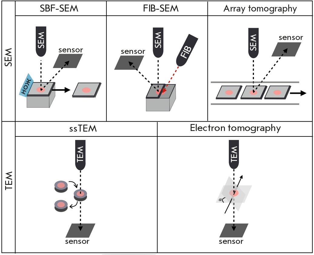 Fig. 2. Methods for obtaining three-dimensional images using TEM and SEM. Regardless of the type of microscopy, the first step is specimen preparation, which involves using polymer media to immobilize the specimen and then cut it into sections. Among specimen immobilization methods, the most popular techniques include fixation using methacrylate [8], cryofixation, freeze-fixation, and Tokuyasu cryosectioning [9]. The next step involves accumulating an array of 2D images using TEM or SEM. The recorded images should be aligned with the XY axes and potential rotation should be eliminated, being especially important for systems that study individual sections (ssTEM and array tomography). Next, the area that will be shown in the final image is selected from the resulting array. The final step is creating a full-fledged 3D image from the recorded 2D segments using specialized software