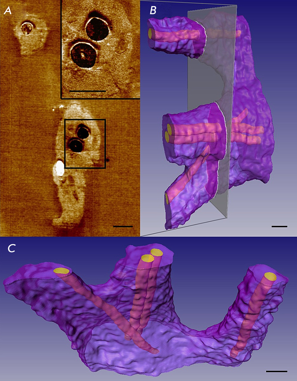 Fig. 13. 3D SPNT reconstruction of a cardiomyocyte enveloping nanofibers. (A) One of the topographic SPM images (phase contrast) used for 3D reconstruction. Insert: a zoomed-in area, shown with a rectangle, including fibers and a membrane fold; (B, C) 3D models of a cardiomyocyte enveloping nanofibers (16.0 × 16.0 × 6.5 µm, 54 sections, 120 nm section thickness). The selected plane in (B) corresponds to the position of the SPM image in (A). The dimensional bar is 1 µm. The figure was taken from ref. [83]