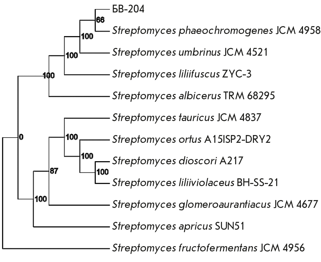 Таким образом, результаты филогенетического анализа, полученные с использованием полифазного таксономического подхода, и сравнение фенотипических признаков позволяют отнести штамм БВ-204 к виду S. phaeochromogenes.