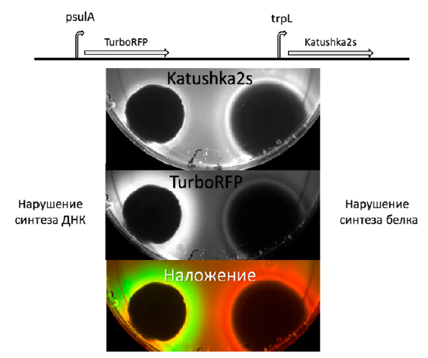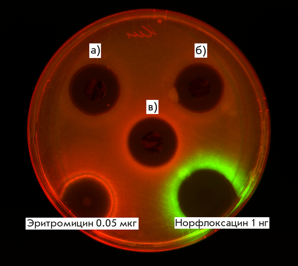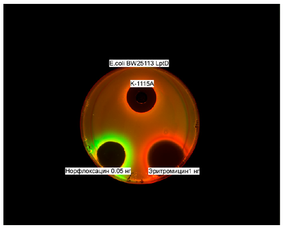 В ходе первичного скрининга была обнаружена антибактериальная активность S. phaeochromogenes БВ-204 в отношении E. coli SS_lptd pDualrep2. Вещество, выделяемое продуцентом, индуцировало экспрессию Katushka2s, что позволяет предположить возможность ингибирования синтеза белка (рис. 3). В качестве положительного контроля использовали 0.05 мкг эритромицина (ингибитора биосинтеза белка), который вызывает экспрессию Katushka2s, и 1 нг норфлоксацина (ингибитора ДНК-гиразы), который вызывает экспрессию TurboRFP. Для удобства сигналы Katushka2s и TurboRFP визуализируются программным обеспечением ChemiDoc MP – красным и зеленым цветом соответственно. На штамме E. coli JW5503 ΔtolC pDualrep2 ингибирование и индукция репортерных флуоресцентных белков отсутствовали.