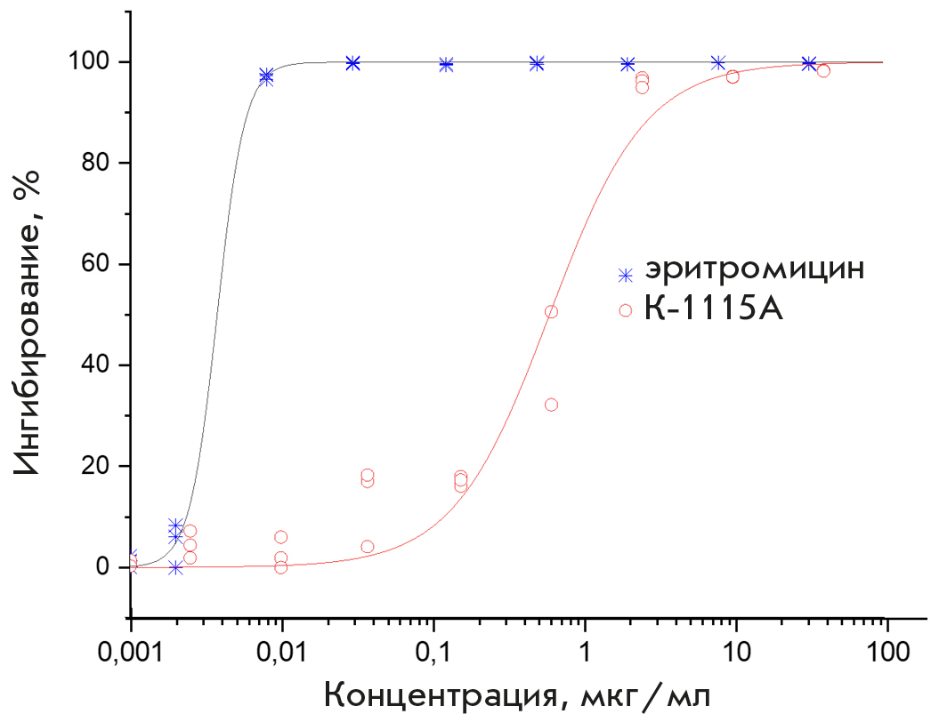 Изучена способность очищенной с помощью ВЭЖХ фракции К-1115А подавлять бесклеточную трансляцию. В качестве референсного ингибитора трансляции использовали эритромицин. Эксперименты проводили в трехкратной повторности. Результаты определения концентрационной зависимости доза–эффект представлены на рис. 5. Значения EC50 составили 0.004 и 0.606 мкг/мл для эритромицина и К-1115А соответственно.