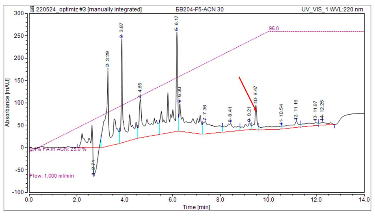 Рис. S10. ВЭЖХ-профиль активной ТФЭ-фракции, элюированной 30–40% ацетонитрила. Стрелкой выделен пик активной фракции
