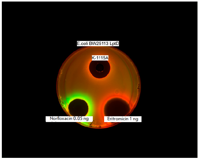 Стоит отметить, что специфичность данного вещества в отношении грамположительных бактерий и рекомбинантного штамма E. coli SS_lptd с делецией в гене lptD свидетельствует о том, что активность К-1115А в отношении бактериальных клеток в значительной степени определяется проницаемостью клеточных барьеров для этой молекулы.