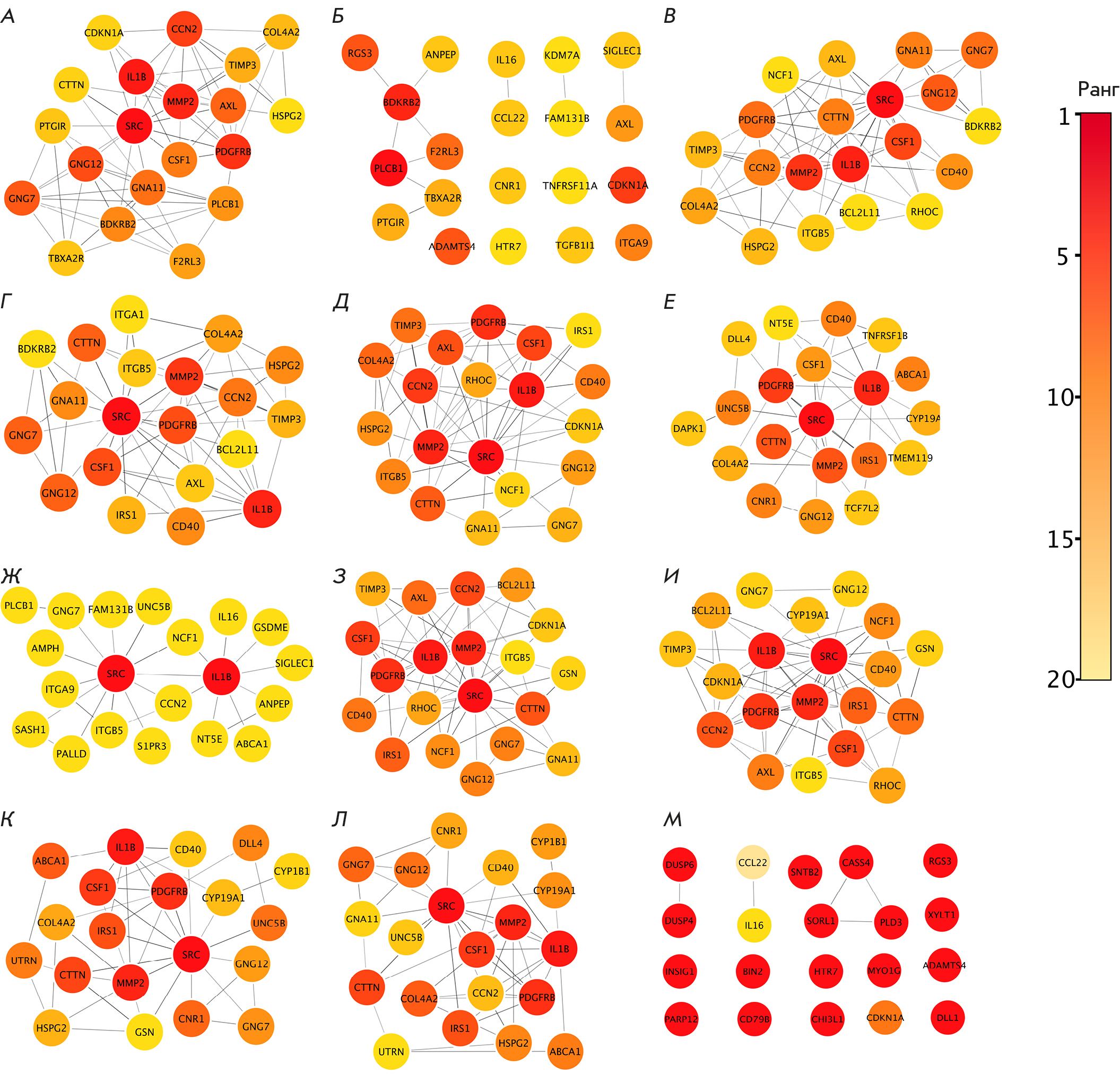 We analyzed the PPI network only for DEGs with increased expression, because it contained more interconnected participants than the DEGs network with reduced expression did, which could potentially make a more significant contribution to the formation of TRAIL resistance in macrophage-like THP-1ad clones. Clustering was then performed among the genes with increased expression in the PPI network using the cytoHubba module plug-in in the Cytoscape software [23]. Clustering was performed using 12 available cytoHubba algorithms to identify the most likely hub genes that could potentially contribute more to the formation of the PPI network and, thus, become potential targets for reducing TRAIL resistance in macrophage-like clones THP-1ad. Using cytoHubba algorithms, 20 genes with the highest rank value were identified in the analyzed PPI network. The rank in the PPI network shows the degree of “importance” of a gene, and the higher the rank (the closer to zero), the more significant this gene is for the formation of the network (Fig. 4).