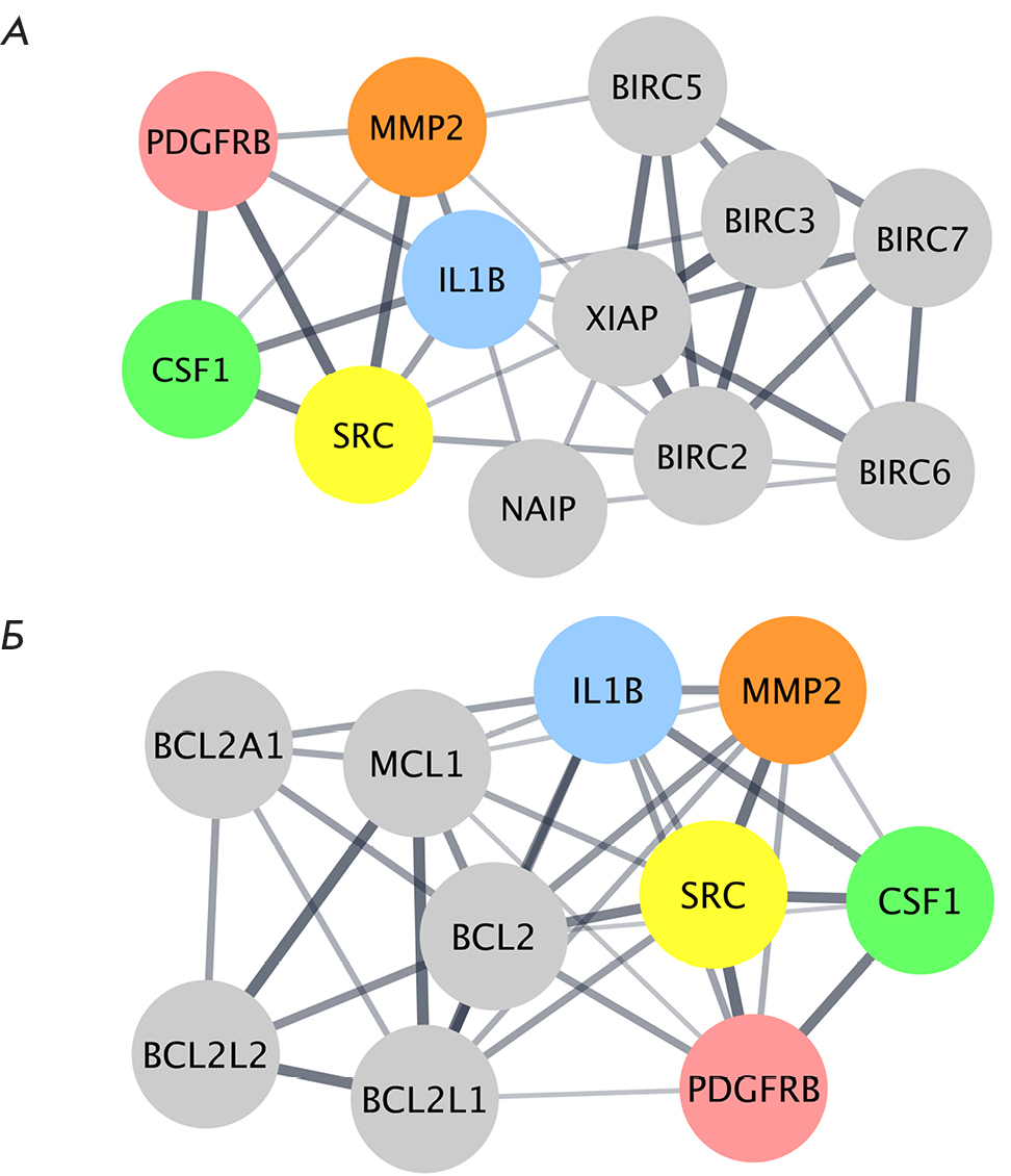 Fig. 5. The discovered IL1B, SRC, PDGFRB, MMP 2, and CSF1 hub genes are connected in PPI networks with antiapoptotic members of the IAPs (A) and BCL-2 (B) families