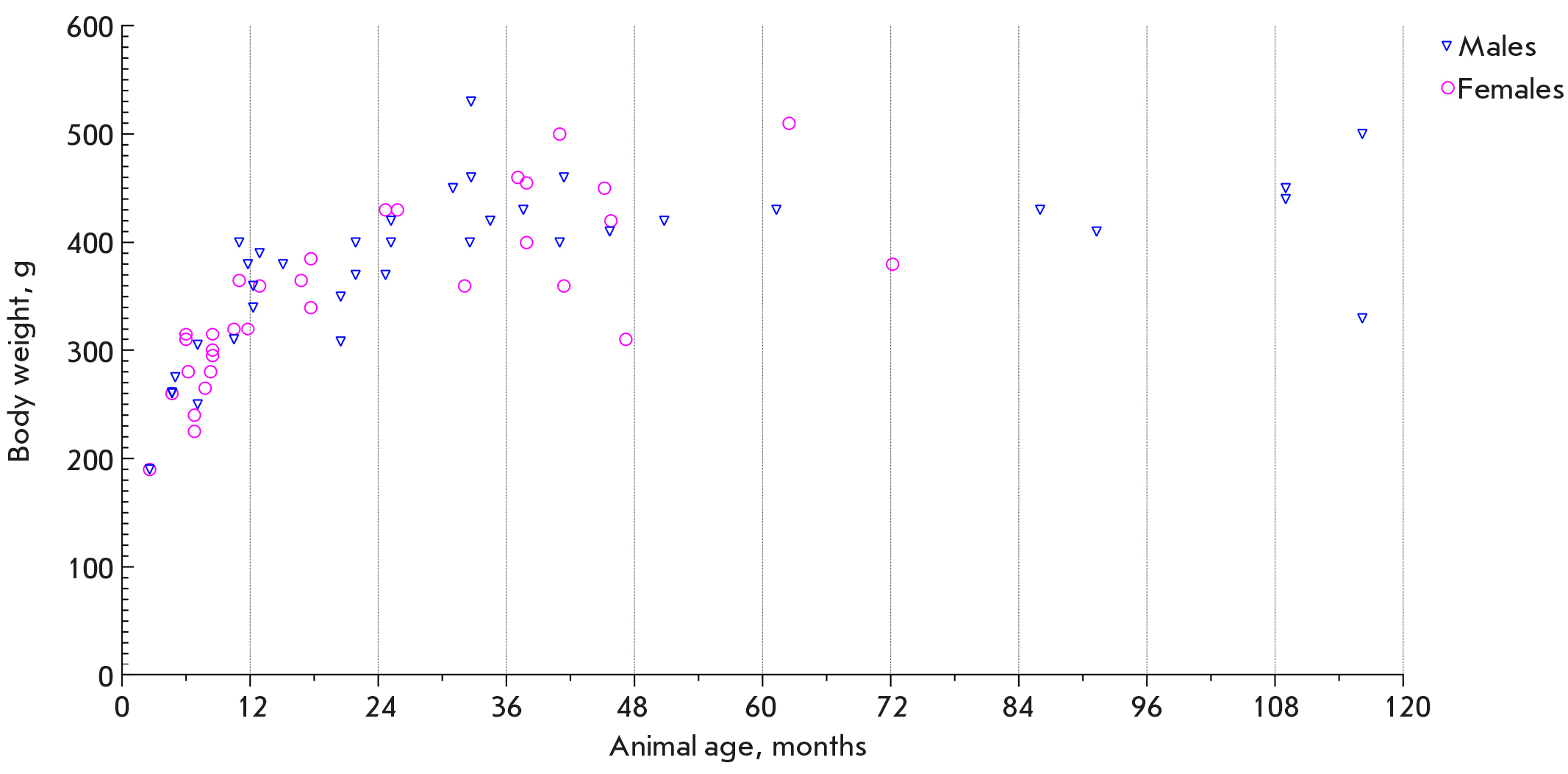 In April 2023, 69 laboratory-bred animals (37 males and 32 females aged from 2.6 months to 9.6 years) were weighed within a one-week period. The results are summarized in Fig. 2.