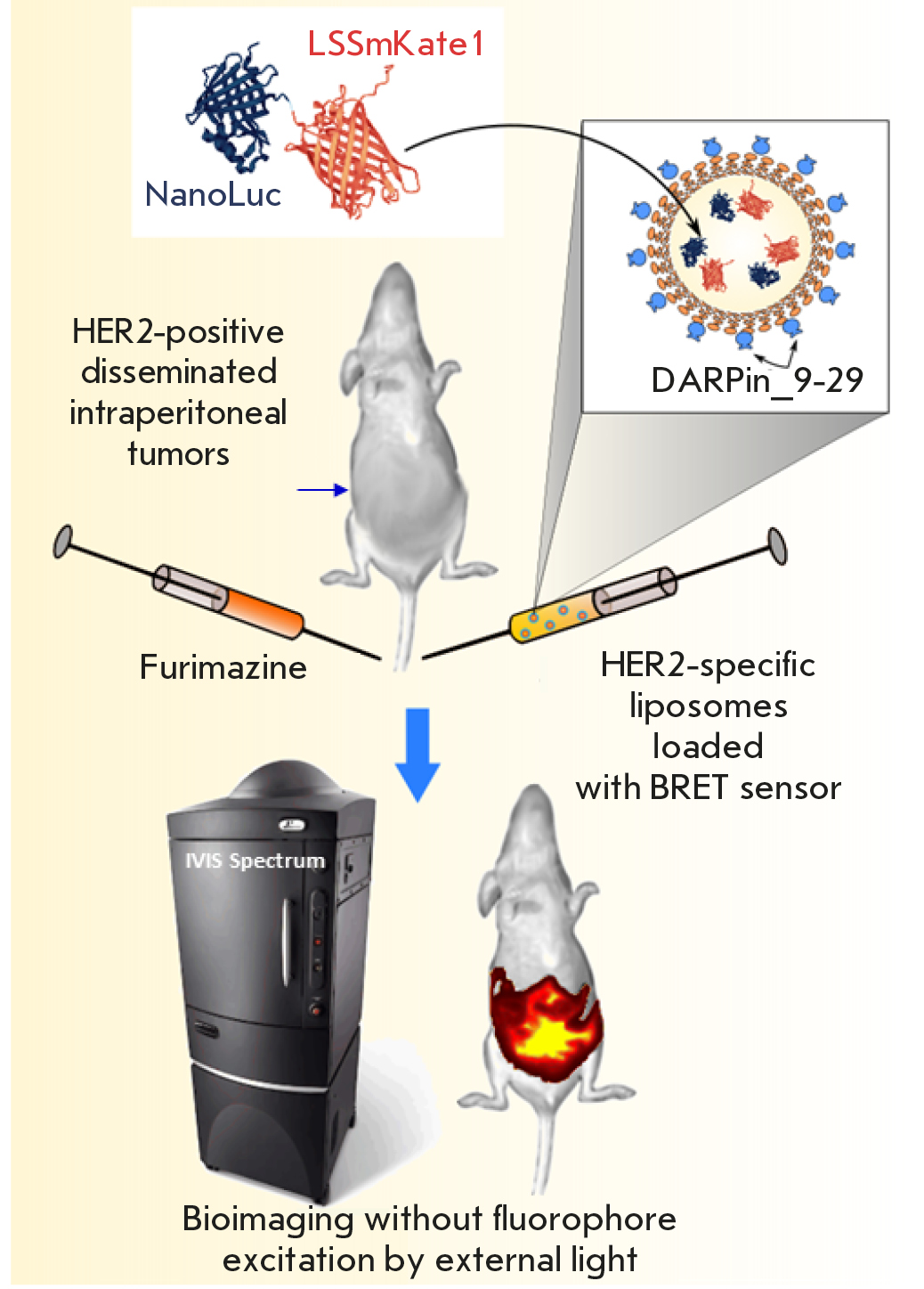 Fig. 1. Targeted nanoplatform based on the NanoLuc-LSSmKate1 BRET sensor and HER2-specific liposomes for the non-invasive diagnosis of deep-seated tumors. Conceptual scheme of the experiment: the genetically encoded NanoLuc-LSSmKate1 BRET sensor is incorporated into liposomes whose outer surface is modified with the DARPin_9-29 HER2-specific module. In the presence of a luciferase substrate in the animal body, the red fluorescent protein is activated without an external light source, allowing intravital real-time detection of deep-seated tumors in the animal body