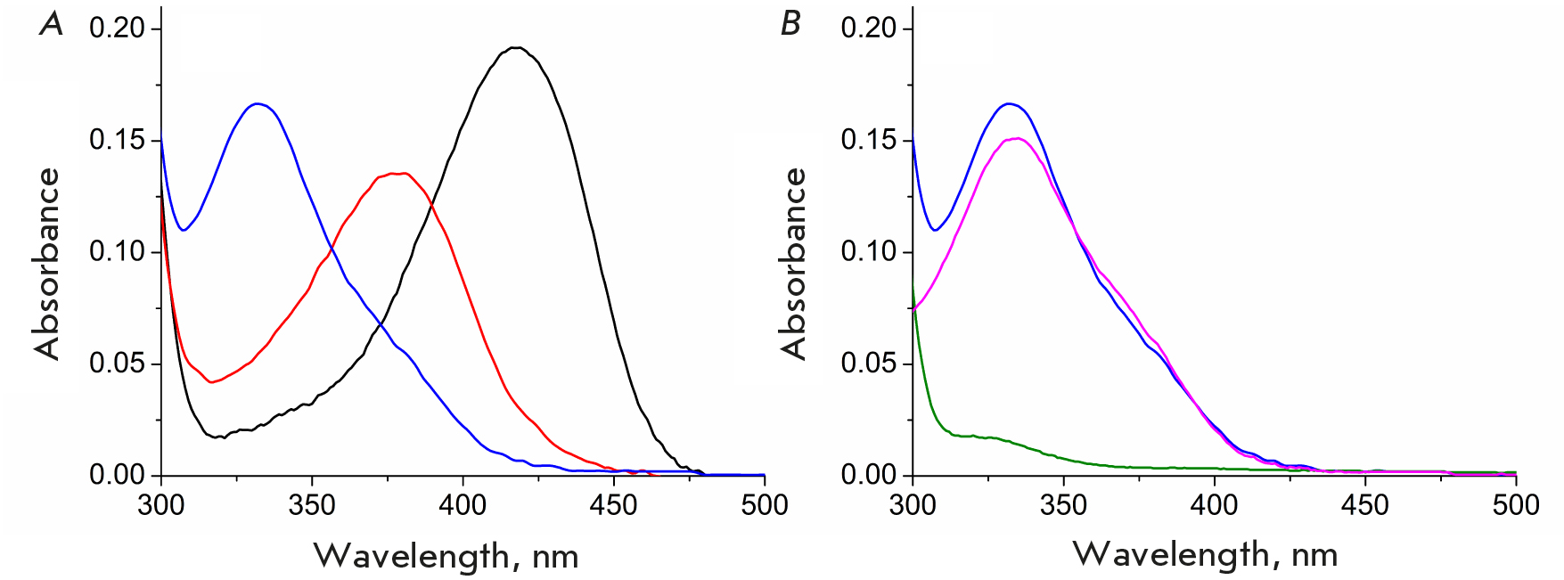 Fig. 3. Spectral changes in TA_Halhy (25 µM) upon addition of 3-aminooxypropionic acid in 50 mM potassium phosphate buffer, pH 8.0, at 25°C: (A) the absorption spectra of holoenzyme TA_Halhy before (black), immediately after addition (red), and after 1 h of incubation with 3-aminooxypropionic acid acid (blue); (B) the absorption spectra of holoenzyme TA_Halhy after 1 h of incubation with 3-aminooxypropionic acid acid (blue) followed by exchange in 50 mM potassium phosphate buffer, pH 8.0 (green); the absorption spectrum of the low-molecular-weight fraction collected by ultrafiltration (pink)