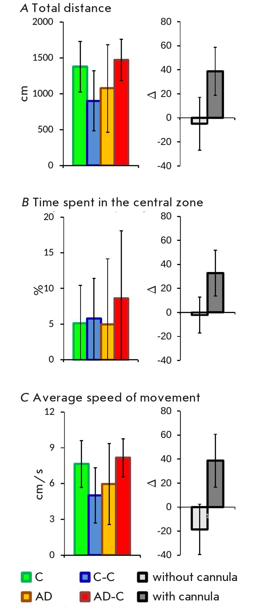 Fig. 2. Behavioral analysis in experimental animals using the Open Field test. (A) Total distance traveled. (B) Total time spent in the central zone. (C) Average speed of movement. Data for each group of experimental animals are presented on the left; pairwise comparisons of control groups and groups receiving Aβ₁₋₄₂ (C/AD and C-C/AD-C) are presented on the right. Data are presented as mean values + standard deviation