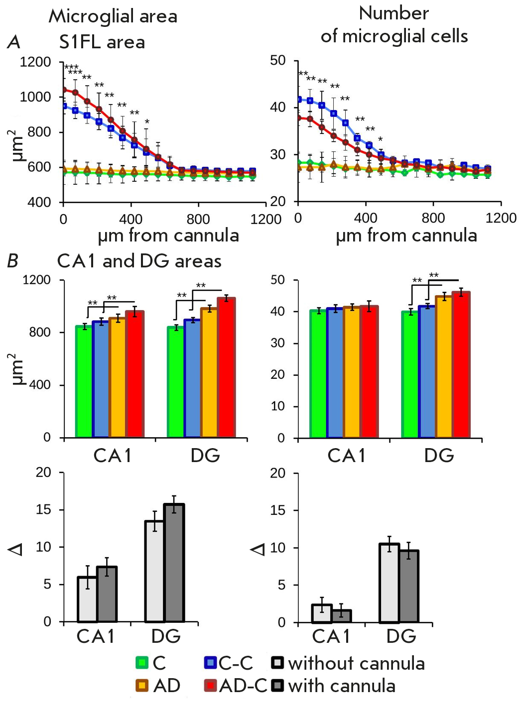 Fig. 3. Immunohistochemical analysis of microglial cells. (A) Changes in the number and area size of microglial cells at a distance from the cannula implantation site to the occipital part of the brain. (B) Effect of cannulation and Aβ₁₋₄₂ administration on microglia in the CA1 and DG fields of the hippocampus. Data for each group of experimental animals are presented at the top; pairwise comparisons of control groups and groups receiving Aβ₁₋₄₂ (C/AD and C-C/AD-C) are presented at the bottom. Data are presented as mean values + standard deviation. Significance: p ≤ 0.05 (*), p ≤ 0.01 (**), p ≤ 0.001 (***)