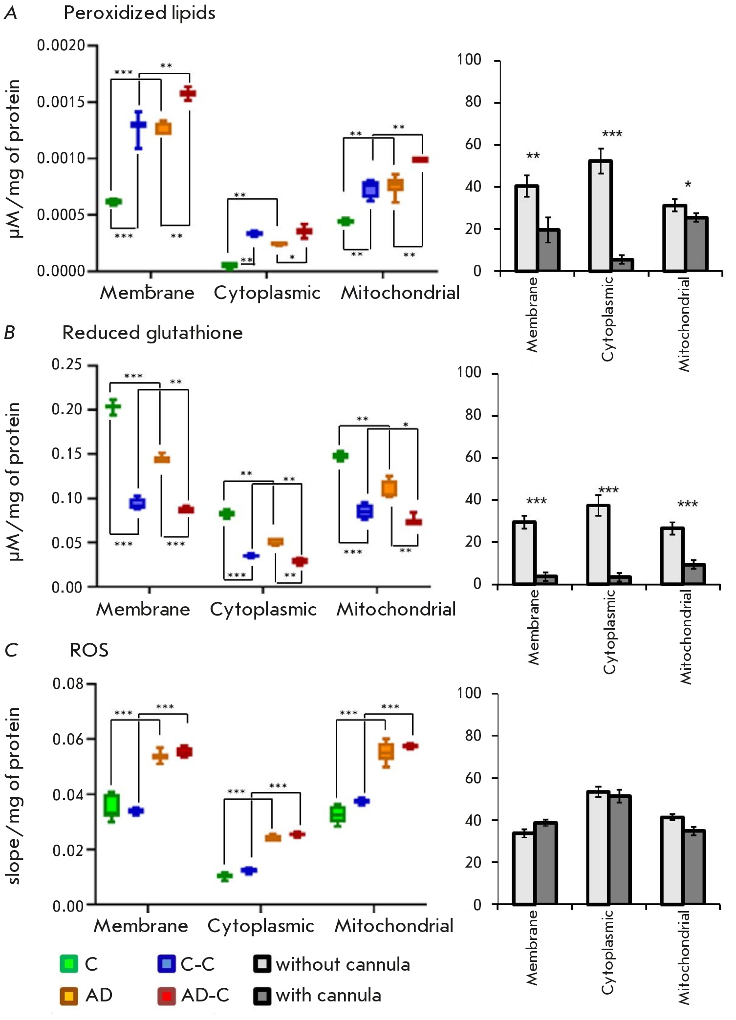 Fig. 4. Biochemical analysis for oxidative stress markers. (A) Level of peroxidized lipids. (B) Reduced glutathione level. (C) ROS level. Data for each group of experimental animals are presented on the left; pairwise comparisons of the control groups and groups receiving Aβ₁₋₄₂ (C/AD and C-C/AD-C) are presented on the right. Data are presented as mean values + standard deviation. Significance: p ≤ 0.05 (*), p ≤ 0.01 (**), p ≤ 0.001 (***)