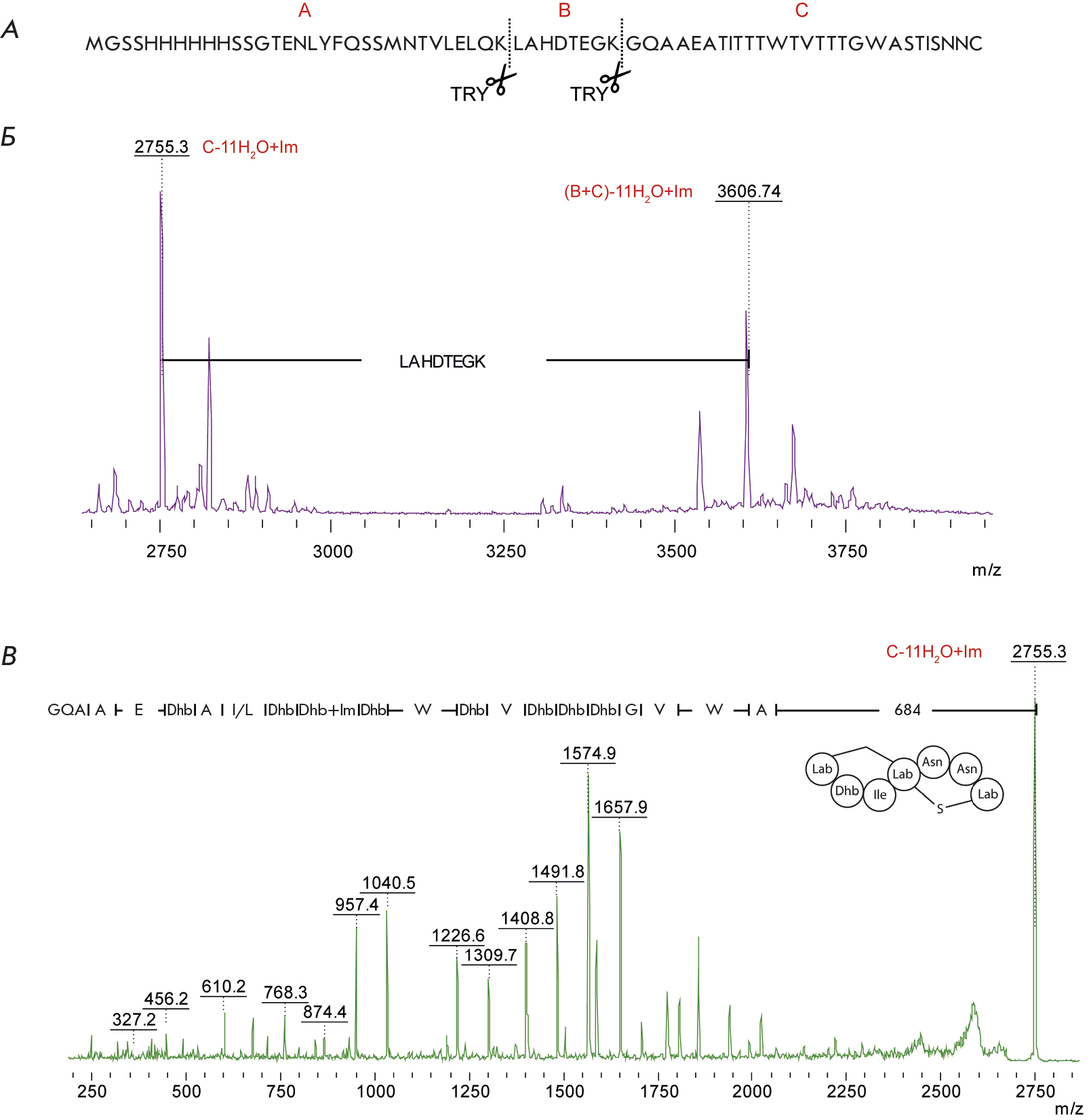 An analysis of the fragmentation spectrum of this molecular ion allowed us to determine the amino acid sequence of the modified peptide and identify 11 dehydroamino acid residues. The presence of Δm/z 683.84 Da in the fragmentation spectrum between the molecular ion and the first fragmented ion corresponds to the labionin ring at the C-terminus of andalusicin. The absence of fragmentation in this spectral region attests to the conformational rigidity of the structure.