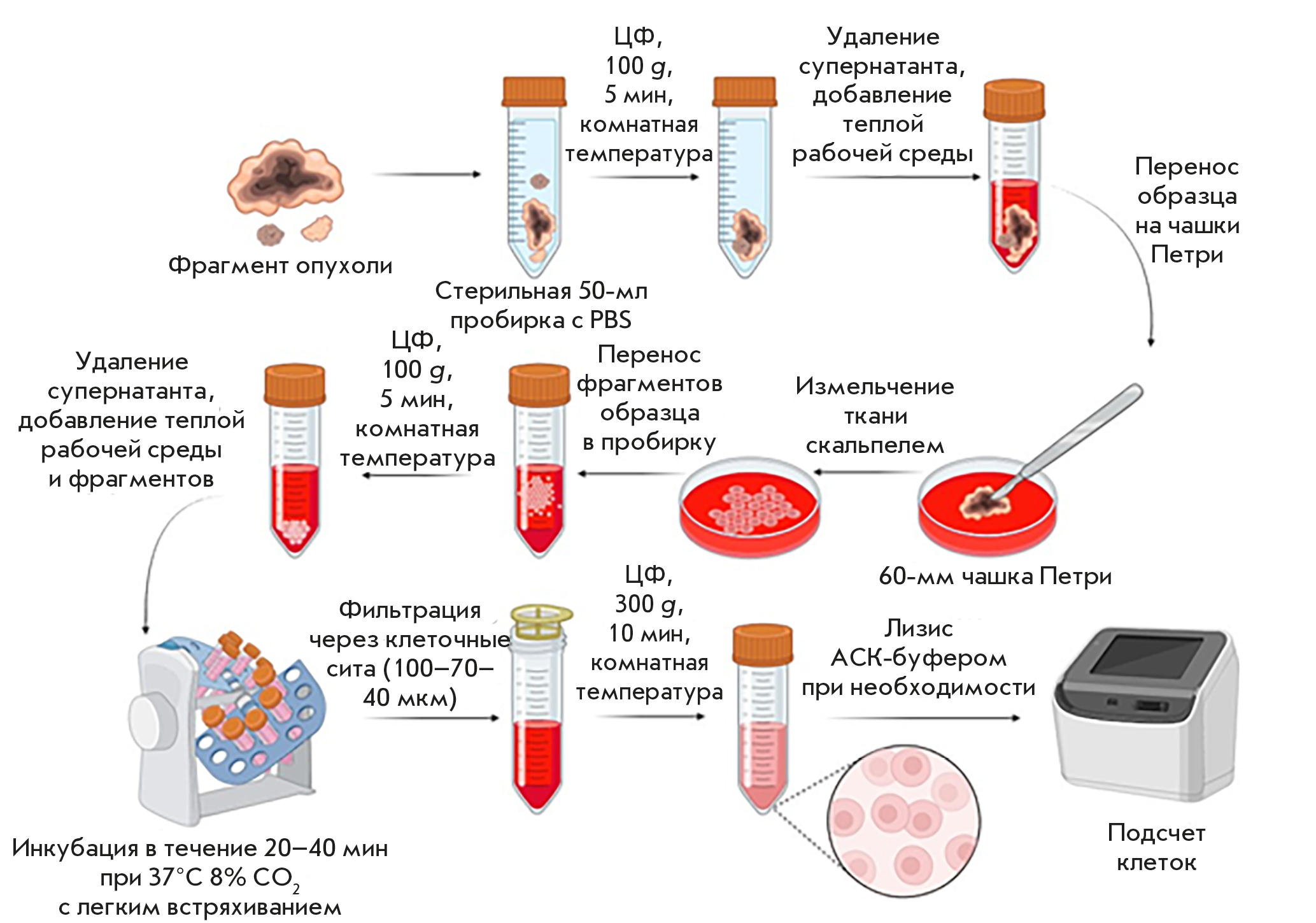 В исследование включено 50 больных злокачественными новообразованиями различных нозологий: КРР (n = 31), НМРЛ (n = 13) и ПКР (n = 6). Выделение клеток из опухолевого материала проводили по протоколу [18] с некоторыми модификациями. Финальная схема получения гомогенной суспензии клеток включала механическое измельчение образца, диссоциацию фрагментов ткани с использованием смеси ферментов и три последовательных этапа фильтрации через клеточные сита с размером пор 100, 70 и 40 мкм (рис. 1).
