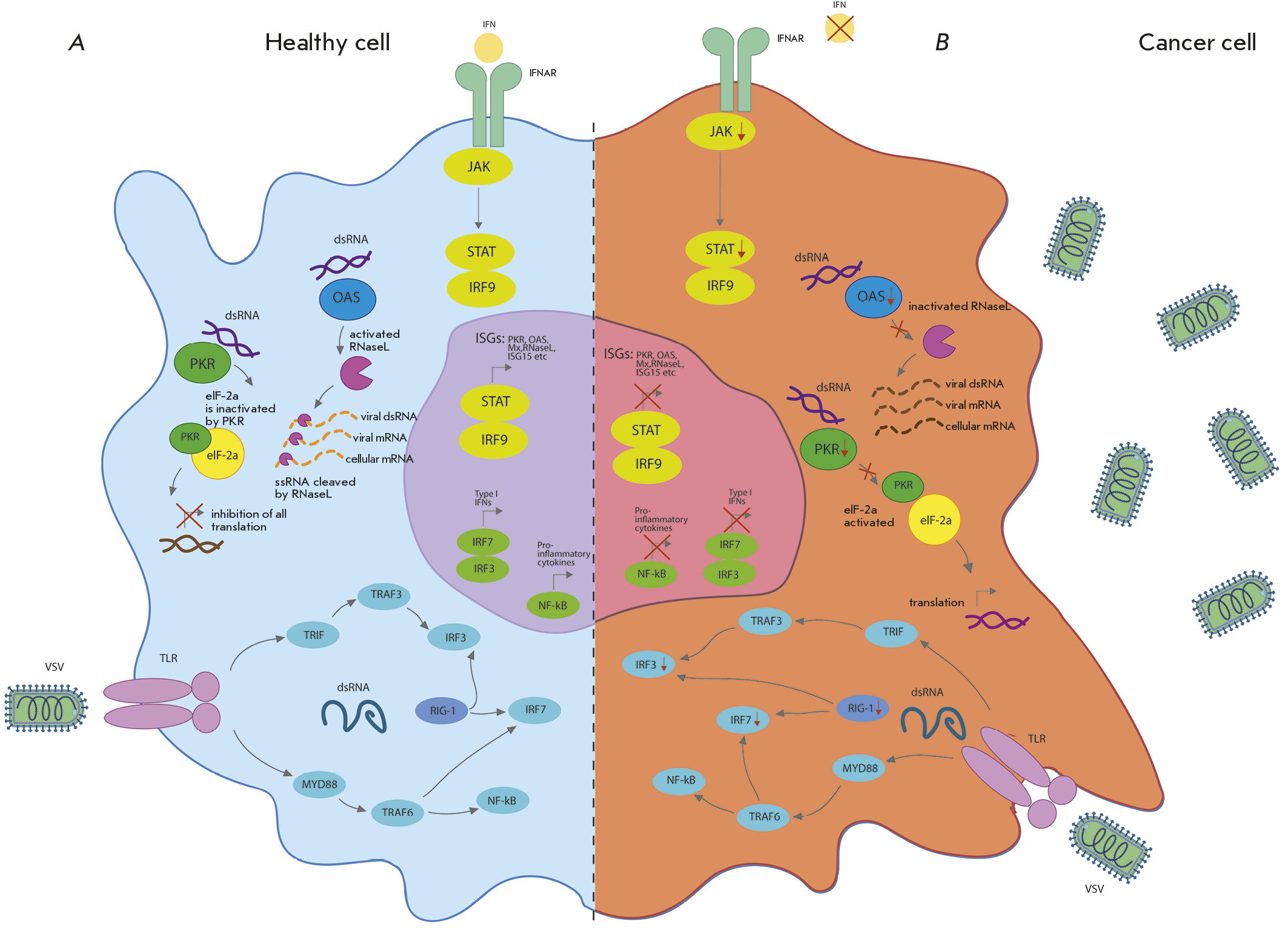Fig. 1. Oncolytic viruses in tumor cells with defective antiviral responses. (A) During viral infection, most normal cells activate an antiviral mechanism that can be triggered by PAMPs associated with the viral pathogen or by detection of viral nucleic acids. TLRs transmit signals through MYD88, inducing the production of pro-inflammatory cytokines and interferons that activate the JAK-STAT signaling pathway; (B) the cancer cell response to a viral infection is altered. In cancer cells, the activity of critical components of the innate signaling pathway, including RIG-I, IRF7, and IRF3, can be suppressed, thus limiting the detection of virus particles and making cancer cells more susceptible to viral replication. Additionally, critical components of the IFN signaling pathway can be inhibited in cancer cells [39]