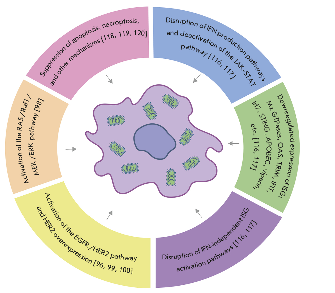 Fig. 2. A cell susceptible to VSV therapy. Knowing the molecular mechanisms underlying the differences in the susceptibility of cancer cells to viruses is essential for elaborating approaches to cancer treatment, identifying biomarkers of susceptibility to specific oncolytic viruses, predicting the effectiveness of virotherapy in each individual patient [96], and improving the effectiveness of cancer treatment