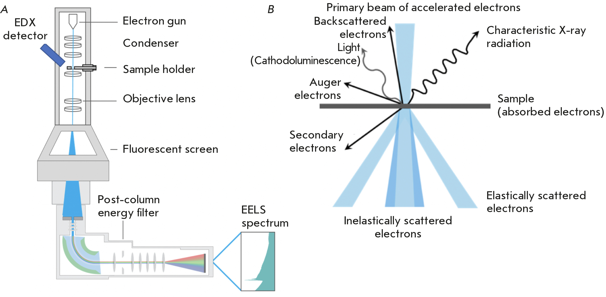 Fig. 1. (А) The architecture of an electron transmission analytical microscope. (B) Visualization of the energy distribution within a thin material following the passage of an accelerated electron beam and the subsequent secondary emissions (generated using BioRender.com)