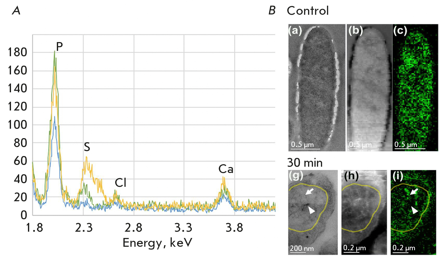 Fig. 5. Analysis of the elemental structure of bacteriophage PhiKZ-infected P. aeruginosa cells was conducted using analytical microscopy techniques. (A) EDX spectra of control cells (blue), and 15 (green) and 30 min (yellow) after infection with PhiKZ phage. The superimposed EDX spectra were normalized to the carbon peak (not shown in graph). The peaks are designated as follows: P for phosphorus, S for sulfur, Cl for chlorine, and Ca for calcium. (B) Distribution of phage and bacterial DNA in the control cells and those infected with P. aeruginosa. TEM images (a, g), HAADF images (b, h), EELS of phosphorus in the pseudonucleus (c, i). The phosphorus signal (P) is shown after background subtraction and multiple scattering correction, using Fourier deconvolution of the spectra. The arrows indicate DNA, the arrowheads indicate P-free regions, and the yellow line indicates the pseudonuclear boundary (reproduced from [25], open source)