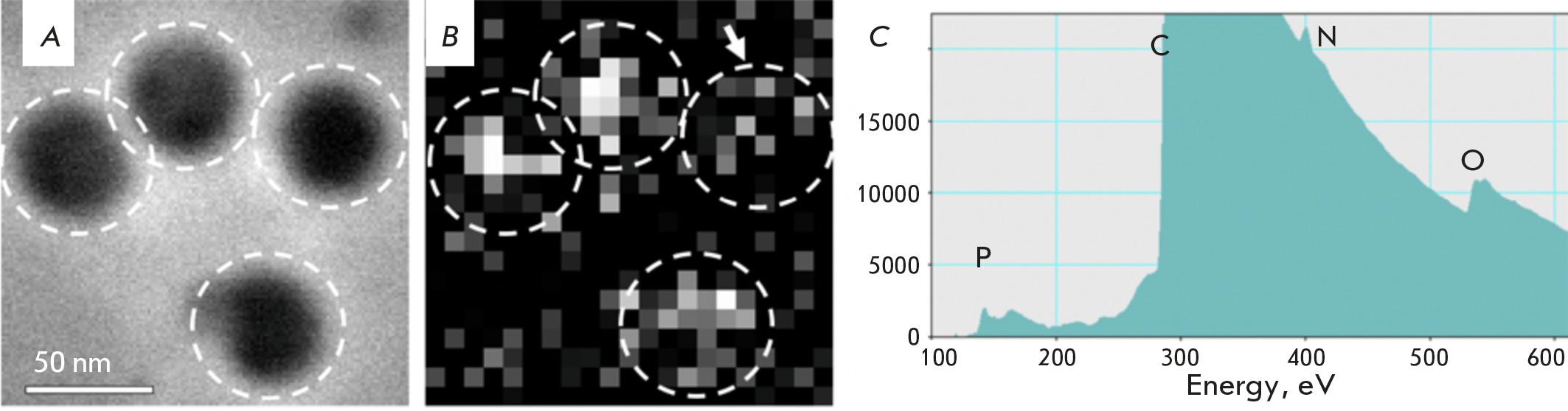 Fig. 8. STEM-EELS analysis of TBEV. (A) STEM image of TBEV virions. (B) Map of the distribution of phosphorus EELS signals within the same sample. The virion boundaries are indicated by white dashed lines, with the arrow pointing to the virion emitting a reduced phosphorus signal. (C) EELS spectrum from a single representative virion. Letters P, C, N, and O represent the spectral edge positions for phosphorus, carbon, nitrogen, and oxygen respectively (reproduced from [37], open source)