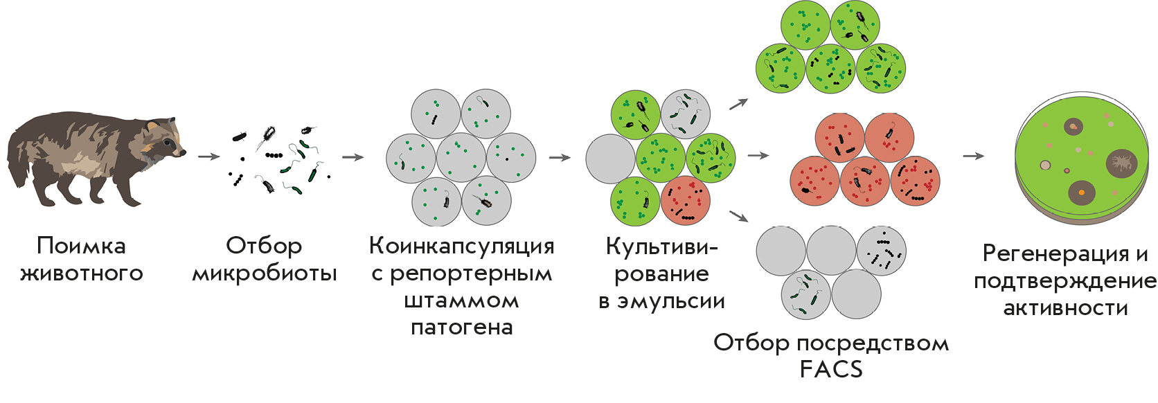 Ранее нами была описана платформа ультравысокопроизводительного скрининга микробных сообществ (рис. 1) [2, 9], основанная на культивировании одиночных клеток микроорганизмов с репортерным штаммом бактерий в изолированных каплях двойной эмульсии с последующим выделением активных фенотипов методом флуоресцентно-активируемой клеточной сортировки. Эту платформу применили для профилирования микробиома ротовой полости енотовидной собаки и выявления штаммов, активных в отношении золотистого стафилококка.