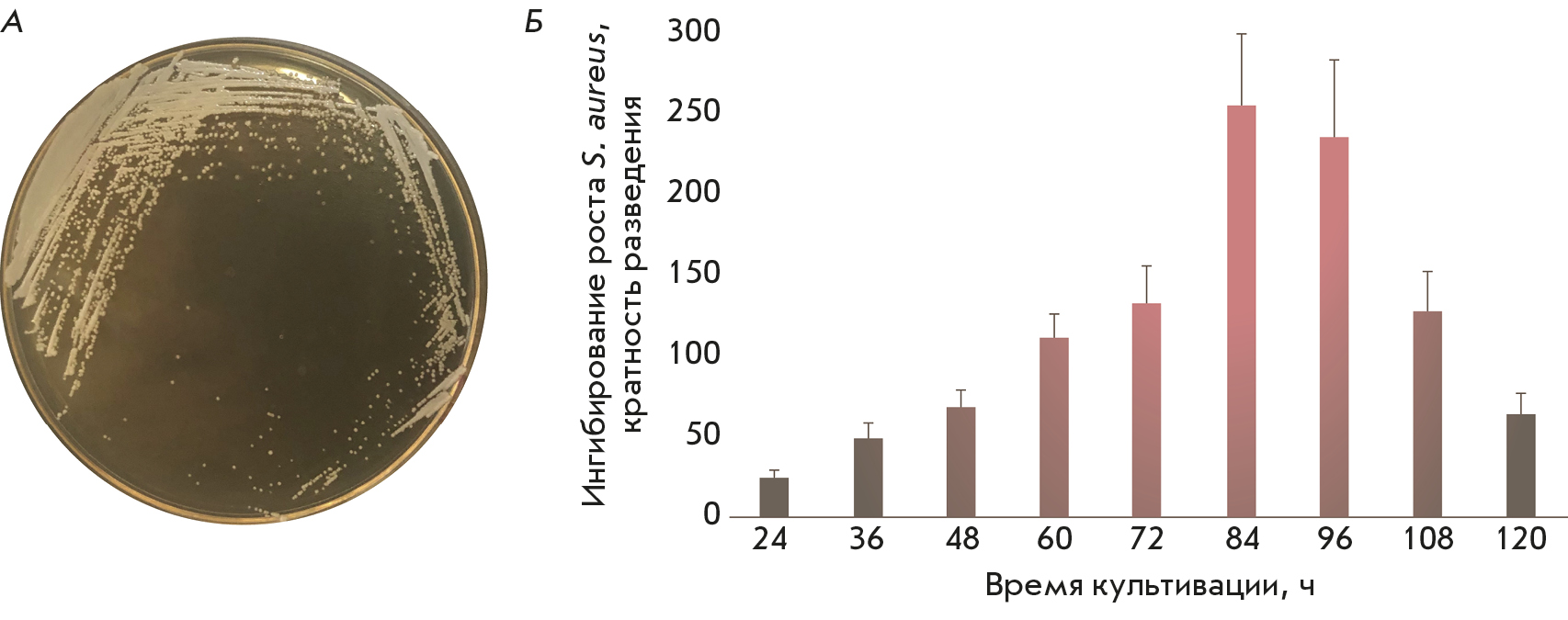 Рис. 2. Фенотип штамма-продуцента Е18 на агаризованной среде BHI (А) и анализ динамики продукции метаболитов, ингибирующих рост S. aureus (Б)
