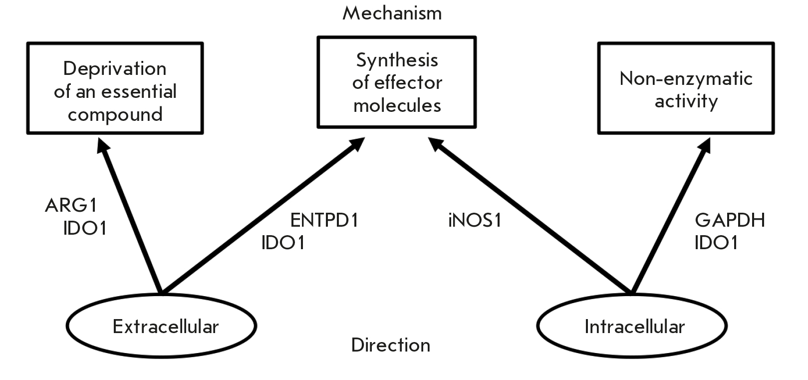 GAPDH, iNOS, and IDO1 (when IDO1 functions as a signaling protein) fall into intracellular direction, since they reside within cells and primarily influence gene expression in the cells where they are present. Notably, the intracellular activity of these proteins depends on the substrate levels in the cellular microenvironment, allowing for fine-tuned regulation of enzyme activity. This principle is best illustrated by GAPDH, which functions as a regulatory molecule only under conditions where its enzymatic activity is inhibited, such as in glucose deficiency.