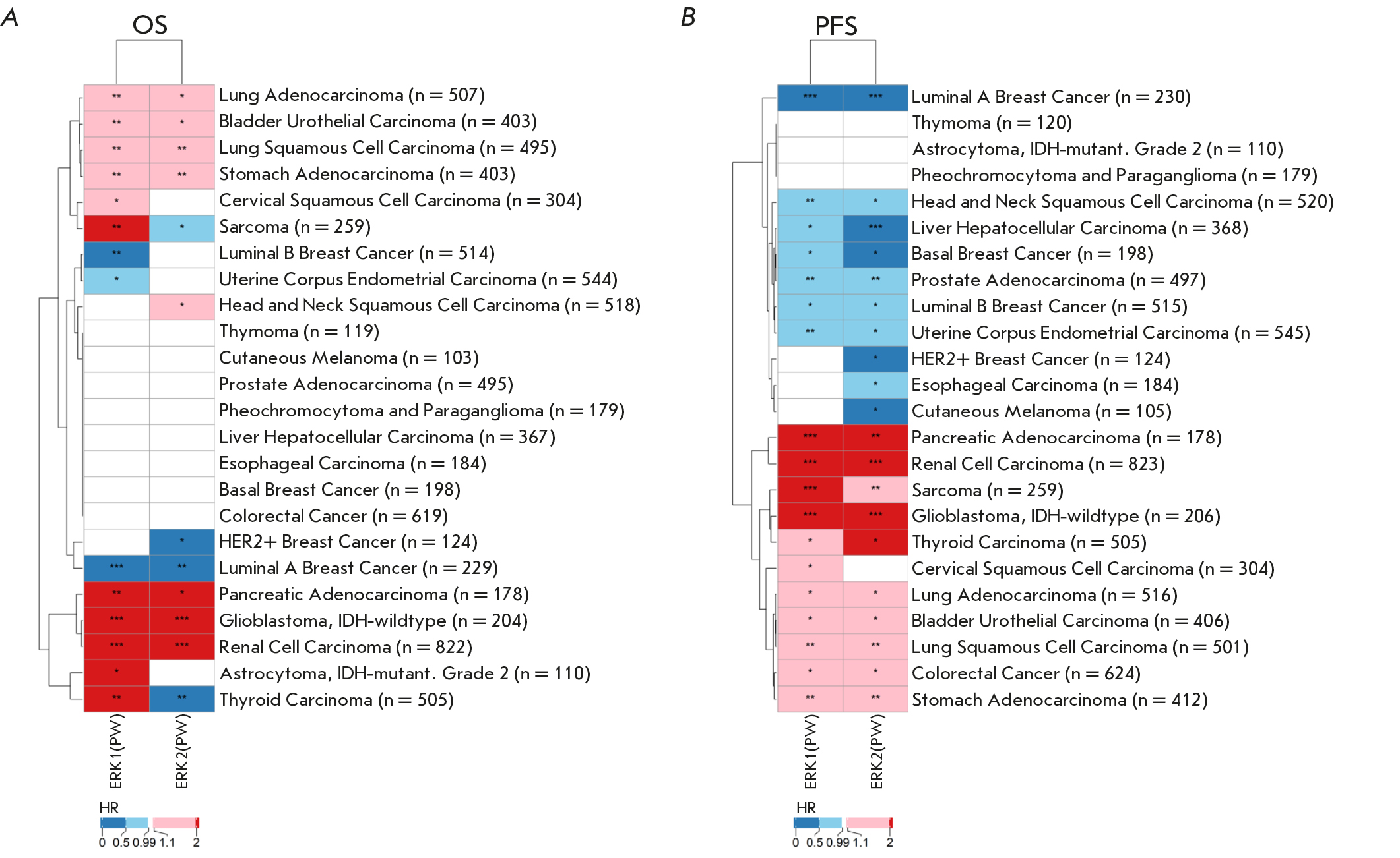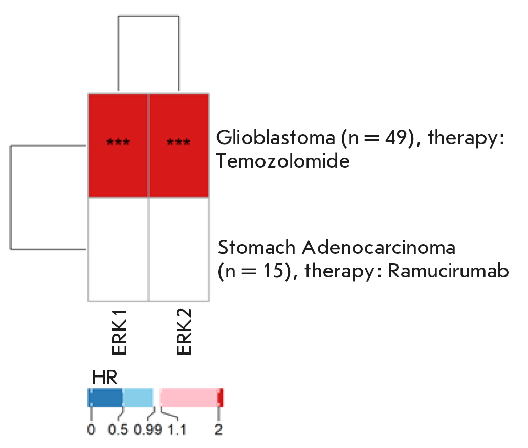 Fig. 7. The heatmap of the hazard ratio values calculated for the activation of the molecular pathways ERK1 and ERK2 based on pathway activation levels in relation to the response to anticancer chemotherapy, as assessed by progression-free survival (PFS). HR – hazard ratio; *** p < 0.001