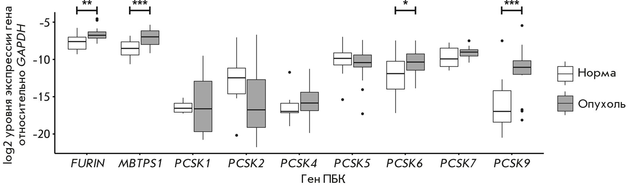 In this work, we studied esophageal malignancies in a way similar to that described above. Quantitative real-time PCR was used to analyze mRNA levels in tumor and adjacent normal tissues in samples obtained from 19 patients with esophageal squamous cell carcinoma. We found significantly increased expressions of the PCSK6, PCSK9, MBTPS1, and FURIN genes in tumor tissue, which may indicate the involvement of these PCs in the formation and progression of esophageal malignancies. We also performed a cluster analysis of PC expression alteration patterns in esophageal cancer samples and the previously analyzed lung cancer samples. As a result, a limited set of scenarios for PC expression alterations during malignant transformation of lung and esophageal cells and, probably, the cells of other organs, were identified.