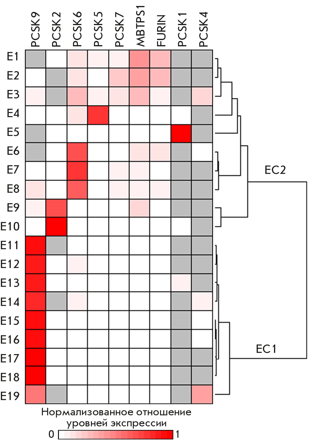 Cluster analysis of PC expression alteration patterns in esophageal tumor compared to normal tissue samples revealed two groups of samples (Fig. 3). The first group included 9 (47%) samples with significantly upregulated PCSK9 expression (Fig. 3, cluster EC1). The second group was less homogeneous (Fig. 3, cluster EC2) and included samples with significantly increased expressions of the PCSK6 (three samples, 16%), PCSK2 (two samples, 10%), PCSK1 (one sample, 5%), and PCSK5 (one sample, 5%) genes, or no significant changes in any individual gene (three samples, 16%). The PC expression alteration patterns identified in esophageal tumors differed from those we had identified previously in lung tumors [13]. For example, esophageal tumors lacked clusters with predominant alterations in the FURIN and PCSK1 expressions, which included most of the lung tumor samples (18 of 30, 60%), whereas lung tumors lacked the cluster with predominant alteration in PCSK9 expression, which was the most abundant in esophageal tumors. Meanwhile, samples with altered PCSK6 expression were detected in both nosologies. Our findings indicate that the PC expression alterations in tumor tissue compared to adjacent normal tissue differ across tumor types, but that there is a limited set of scenarios for PC expression alterations in each case.
