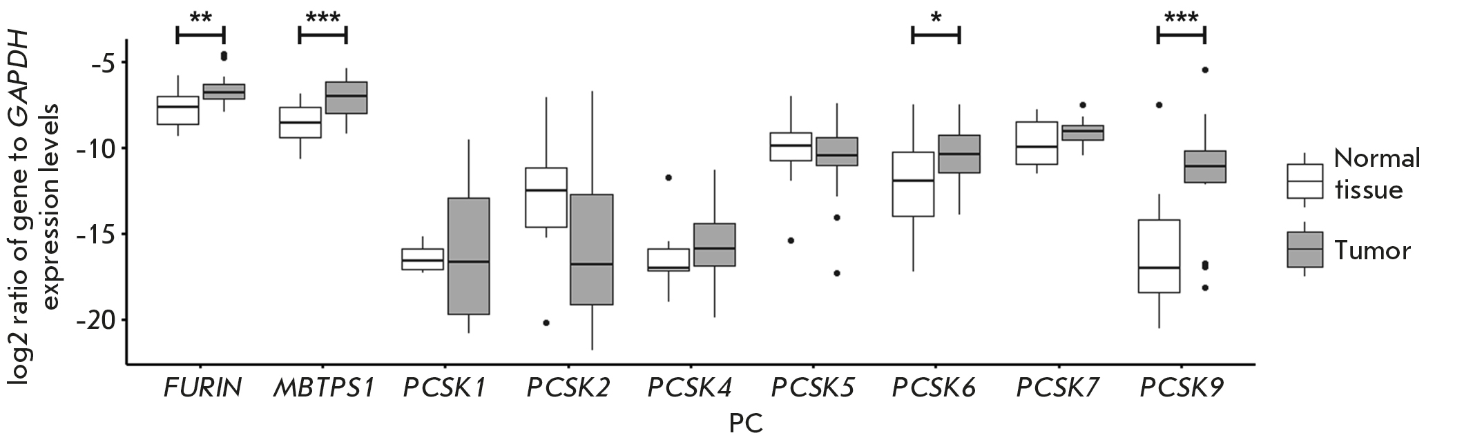 In this study, the mRNA levels of all nine proprotein convertase (PC) genes in the 19 paired samples of human esophageal malignant and normal adjacent tissues were analyzed by quantitative real-time PCR (Fig. 1, Appendix Table A1). As expected, we detected expression of the FURIN, PCSK5, PCSK6, PCSK7, and MBTPS1 genes encoding ubiquitous enzymes in all or the vast majority of both tumor and normal tissue samples. PCSK1, PCSK2, PCSK4, and PCSK9 expression is considered tissue-specific and atypical of esophageal tissues [16–18]. Indeed, PCSK1 mRNA was detected only in two tumor and two normal tissue samples and PCSK4 mRNA was identified in four tumor and two normal tissue samples. At the same time, PCSK2 expression, typical of neuroendocrine cells, was detected in 5 tumor and 11 normal tissue samples. The causes behind the atypical PCSK2 expression in esophageal tissues are unclear. We also detected PCSK9 expression, which is normally observed mainly in liver, kidney, cerebellum, and small intestine cells, in 15 tumor and 9 normal esophageal tissue samples. However, this result was not unexpected, because PCSK9 expression in esophageal tumors was detected previously [19]. The possible causes of this phenomenon will be discussed below.