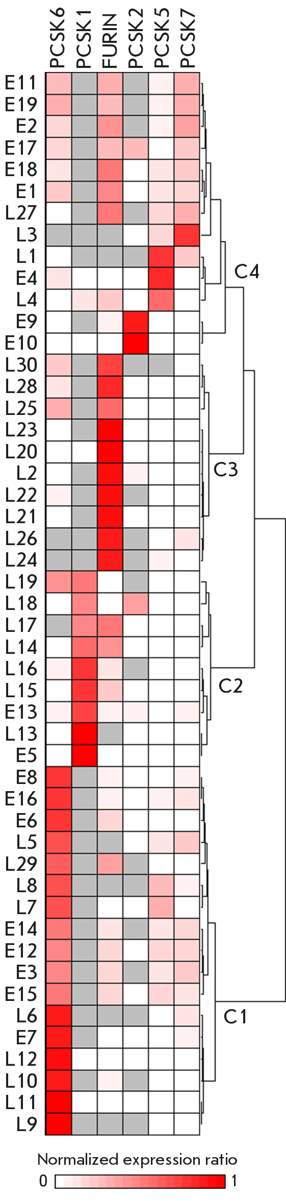 Unfortunately, the available information may only be suggestive of the nature of the differences between the identified sample groups. For example, high PCSK6 expression in group C1 may indicate active restructuring of the tumor microenvironment and, thus, correlate with the invasiveness and/or metastatic activity of the tumor [25, 26]. Increased PCSK1 expression in group C2 may be related to the possible origin of the tumor from neuroendocrine cells [34, 35]. Increased levels of FURIN mRNA in group C3 may be associated with active expression and processing of the insulin-like growth factor 1 receptor (IGF-1R) in tumors, indicating their increased aggressiveness [36]. Obviously, further research is required to elucidate the causes underlying the identified scenarios of PC expression alterations. Probably, more detailed investigation of a larger batch of samples from different nosologies is required, including analysis of additional clinical characteristics, in particular, patients’ resistance to drugs, relapse rates, and patients’ survival time.