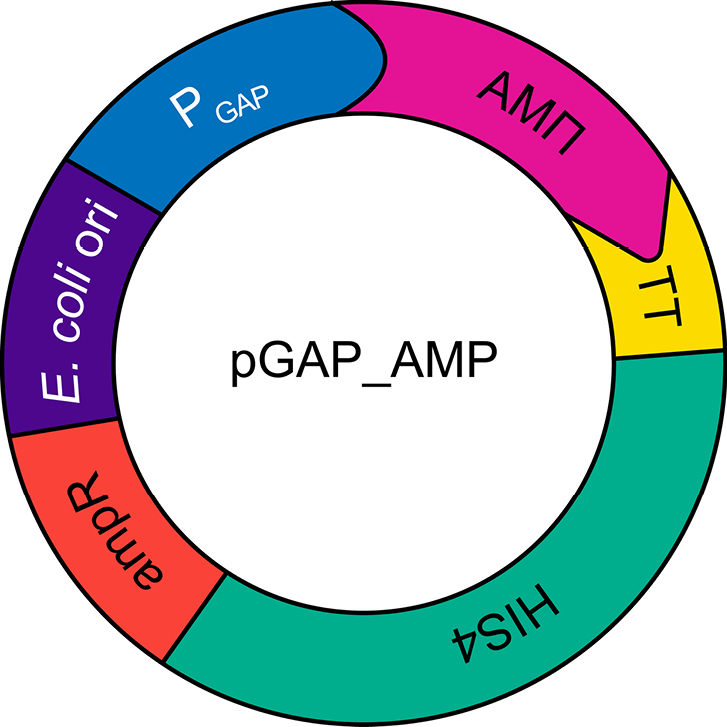The nucleotide sequences of the AMP genes were optimized for production in P. pastoris cells using the GeneArt GeneOptimizer software (Thermo Fisher Scientific Inc.). The genes were synthesized by overlapping PCR and cloned into the expression vector pGAP4 using a HiFi DNA assembly kit (New England Biolabs). The cloned AMP genes and the gene encoding the yeast alpha-mating factor, which ensures the secretion of peptide molecules in the growth medium, lay within the same reading frame. During transport, the alpha-mating factor sequence was processed by KEX2 endopeptidase and the active peptide was released into the growth medium. The AMP library in the vector pGAP_AMP was linearized at the AvrII restriction site to be further transformed into yeast cells.