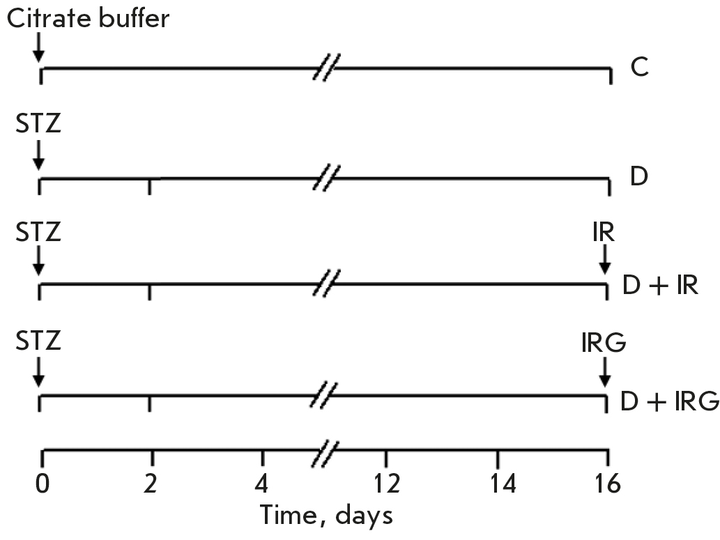 Fig. 1. Experimental protocol scheme. D – rats receiving STZ (60 mg/kg in 0.1 M citrate buffer; pH 4.5; intravenously); D + IR – DM rats (STZ, 60 mg/kg; intravenously) subjected to regional myocardial IRI; D + IRG – DM rats (STZ, 60 mg/kg; intravenously) subjected to regional myocardial IRI, receiving G (1 mg/kg, bolus intravenous administration at the onset of reperfusion). Cit. buffer – 0.1 M citrate buffer (pH 4.5); STZ – streptozotocin