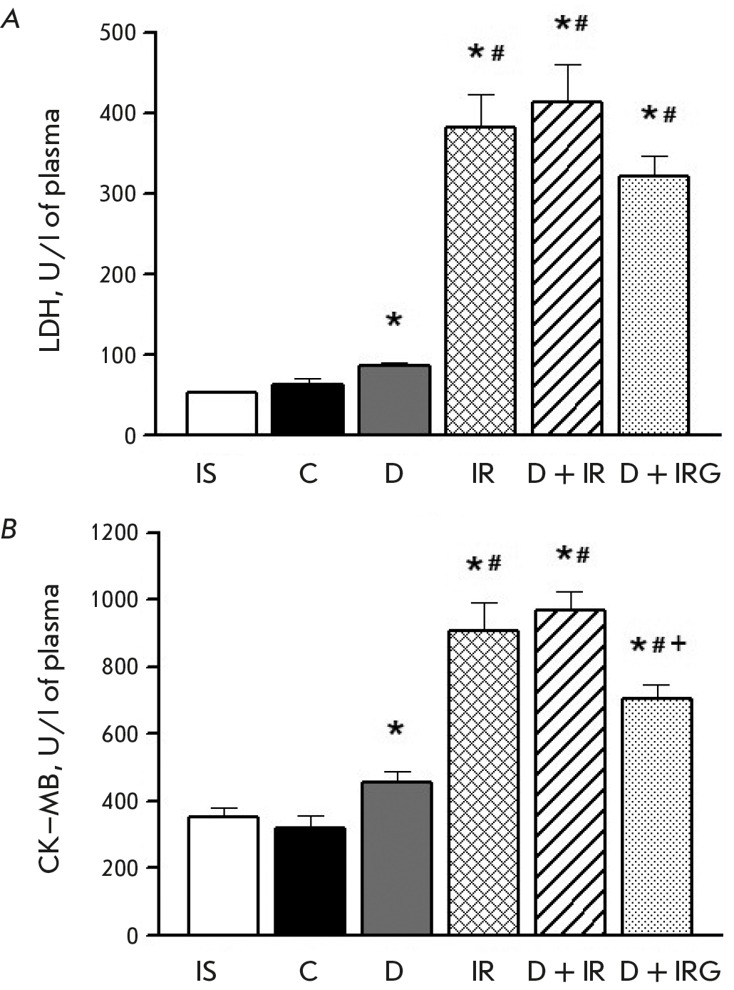 Fig. 3. Lactate dehydrogenase (LDH, A) and creatine kinase-MB (CK-MB, B) activities in rat plasma. Values represent M±m for groups of 5 animals. p < 0.05 compared to: * – C, # – D, + – D + IR. IS – initial state