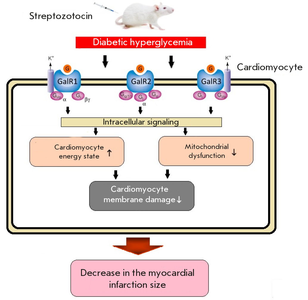 The present study confirms the effect of STZ-induced DM on myocardial susceptibility to IRI in rats. We showed that G administration significantly reduces MI upon reperfusion restoration. This benefit is due to the induction of intracellular signaling through the G-protein-coupled transmembrane receptors GalR1, GalR2, and GalR3 (Fig. 5). The protective effect of G manifested itself in less mitochondrial dysfunction, resulting in an improved energy state of the reperfused myocardial region. These positive shifts in the myocardial energy state were accompanied by a reduction in damage to the cell membrane. Taken together, the obtained results indicate that it is possible to use G as an accompanying therapy in DM1 complicated by myocardial IRI. In this regard, further study into the molecular mechanisms that reduce reperfusion stress in the diabetic myocardium using native and modified galanin peptides seems an important direction.