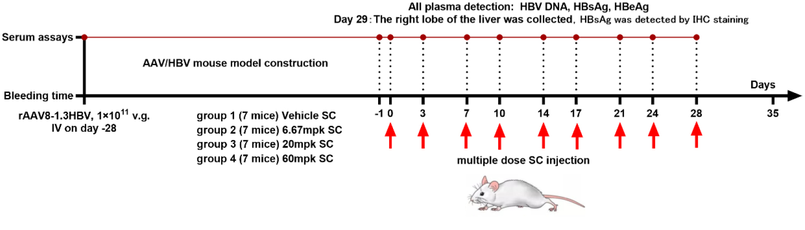Evaluation of the anti-HBV activity by multiple dose injection. All 35 mice successfully received 200 µl of the rAAV8-1.3HBV solution via the tail vein. After screening, 28 mice were selected into groups and labeled as group 1 through group 4. Blood samples were collected from infected mice via the subclavian vein on days 24 and 44 post-infection and stored at –80°C for detecting HBV DNA, HBsAg, and HBeAg [14]. On day 0, mice in groups 1–4 received subcutaneous injections of either a vehicle or a test compound. Blood samples were collected from all mice through the subclavian vein on days -1, 1, 5, 8, 12, 15, 19, 22, 26, and 29 post-infection for detecting HBV DNA, HBsAg, and HBeAg. All mice were sacrificed by CO2 inhalation on day 29, and the right lobe of the liver was harvested and preserved in formaldehyde, transferred to PBS, and embedded into paraffin blocks to conduct IHC staining for detecting HBsAg. Figure 2 illustrates the experimental protocol design. The results of HBV DNA, HBsAg, HBeAg analysis are presented as the mean value ± standard deviation per group of mouse samples, unless otherwise specified.