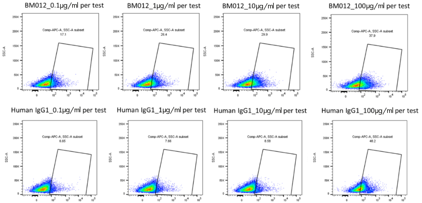 The antibody-dependent cellular cytotoxicity (ADCC) and complement-dependent cytotoxicity (CDC) effects. The binding rate of the tested antibody to the target cell was verified as follows. Different concentrations of HT-102 (0.1, 1, 10, and 100 µg/ml) were prepared and incubated with HepG2-HBsAg stably transfected cells at 4°C for a specified duration. A negative control was included simultaneously. Fluorescent secondary antibody APC-anti-human IgG Fc (Jackson ImmunoResearch, cat. # 109-605-098, USA) was added and incubated. Finally, flow cytometry was employed to determine the binding rate.