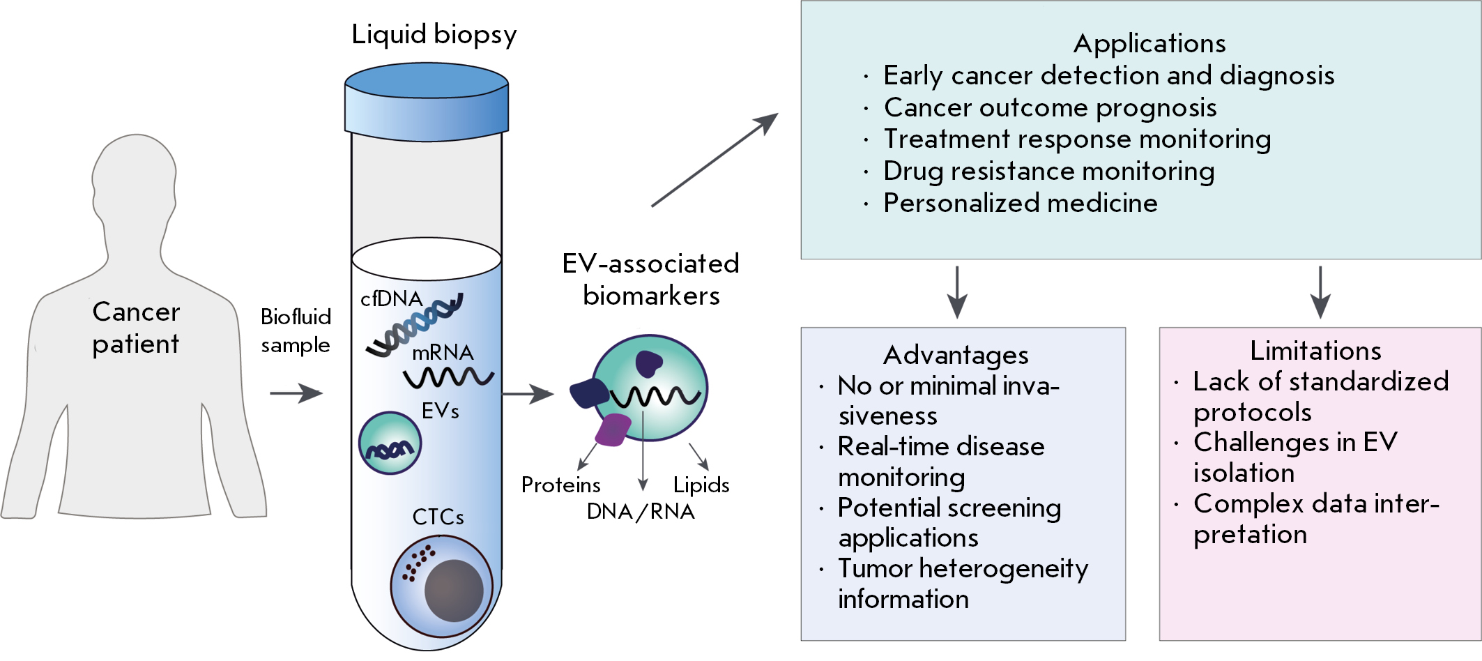 EVs can be isolated from all types of human biological fluids, in particular blood, tears, urine, saliva, cerebrospinal fluid (CSF), etc. This versatility makes EVs a promising tool for cancer diagnosis, especially in terms of liquid biopsy. Liquid biopsy is an innovative technique used to analyze circulating tumor cells, extracellular nucleic acids, and EVs (Fig. 2). This minimally invasive method enables real-time monitoring of tumor progression [40]. The advantages of EVs analysis using liquid biopsy are as follows: (1) higher EVs concentrations in biological fluids than in circulating tumor cells; (2) EVs, compared with circulating DNA, provide a better insight into producer cells; and (3) the high biological stability of EVs in the aggressive tumor environment [41]. EVs isolated from tumor cells carry a wide range of cytosolic and surface proteins, DNAs, RNAs, as well as various lipids and glycans; so, they can potentially be used in screening for early cancer stages, monitoring cancers, and predicting the response to therapy. Below, we discuss the application of EV analysis to the diagnosis of the most common cancers using liquid biopsy.