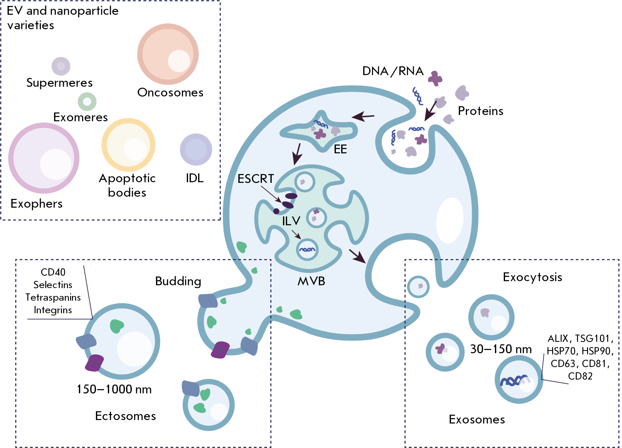 Существуют различные пути формирования внутрипросветных везикул внутри мультивезикулярных телец. Такие пути разделяют на связанные с комплексами белков ESCRT и на не зависящие от ESCRT. Существует четыре комплекса ESCRT (ESCRT-0, ESCRT-I, ESCRT-II и ESCRT-III), которые взаимодействуют с ферментами на мембране эндосом в процессе биогенеза экзосом. Классический путь, зависящий от ESCRT, включает распознавание убиквитинированных белков в мембране эндосом субкомплексами ESCRT и опосредованное белком VPS4 образование внутрипросветных везикул. Альтернативный путь – это путь синдекан-синтенин-ALIX, при котором отпочкование везикул и сортировка грузов могут происходить независимо от ESCRT, а VPS4 играет ключевую роль на этапе финального отделения. Путь, не зависящий от ESCRT, использует церамид, генерируемый из сфингомиелина посредством nSMase2, формирующий домены липидных рафтов и инициирующий созревание внутрипросветных везикул внутри мультивезикулярных телец. Таким образом, молекулярный состав выделяемых экзосом зависит от путей, через которые они проходят в процессе своего формирования. Однако существует ряд общих белков, характерных для большинства изученных экзосом. К ним относятся белки, участвующие в транспорте и слиянии мембран (семейство GTPаз Rab и аннексины), белки, связанные с биогенезом экзосом (белки комплекса ESCRT, ALIX, TSG101), белки теплового шока (HSP70 и HSP90), тетраспанины (CD63, CD81 и CD82), а также белки цитоскелета [12]. Помимо белков, в экзосомах могут обнаруживаться характерные липиды. Липидный состав экзосом зависит от типа клеток-продуцентов, их стадии развития и функций. Например, показано, что фосфолипид BMP (бис(моноацилглицерол)фосфат) стимулирует формирование внутрипросветных везикул [13], а холестерин участвует в сборке системы ESCRT [14]. В число липидов, наиболее распространенных в мембране экзосом, входят сфингомиелин, фосфолипиды, ганглиозид GM3 и холестерин [15]. Некоторые мембранные липиды экзосом могут служить полезными диагностическими инструментами: например, экзосомы с фосфатидилсерином на поверхности происходят из злокачественных клеток [16].