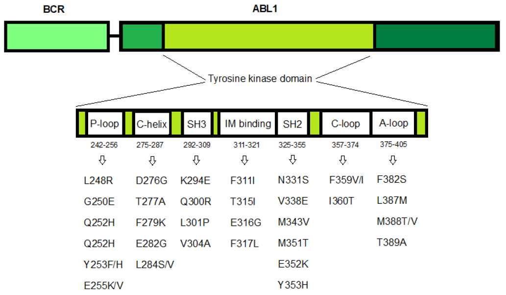 Fig. 1. BCR::ABL tyrosine kinase domain mutations identified in patients with Ph-positive leukemia