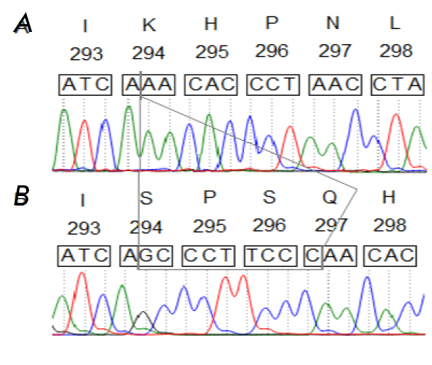 After securing informed consent, treatment was initiated according to the Ph+ALL-2012m protocol, in combination with imatinib (600 mg) [25]. After 8 months of therapy that included two induction and three consolidation phases, complete hematologic remission and a profound molecular response (BCR::ABL/p210: 0.002%) were noted. However, six months later, the patient had a relapse (blasts: 15%, BCR::ABL/p210: 105%). After three weeks of therapy (100 mg dasatinib + 20 mg dexamethasone), the number of blasts was reduced to 4.8% and the level of BCR::ABL/p210 decreased to 11.8%. Sanger sequencing analysis showed a T-to-C nucleotide substitution at position 949 (NM_005157) of the ABL gene, resulting in the F317L point mutation. Meanwhile, a novel nine-nucleotide insertion (GCCCTTCCC) at a position between 1073 and 1074 (NM_005157) of the ABL gene was found. The latter mutation caused a lysine substitution at position K294 for four amino acid residues; namely, serine-proline-serine-glutamine (K294SPSQ), which preceded histidine at position H295 (Fig. 3).
