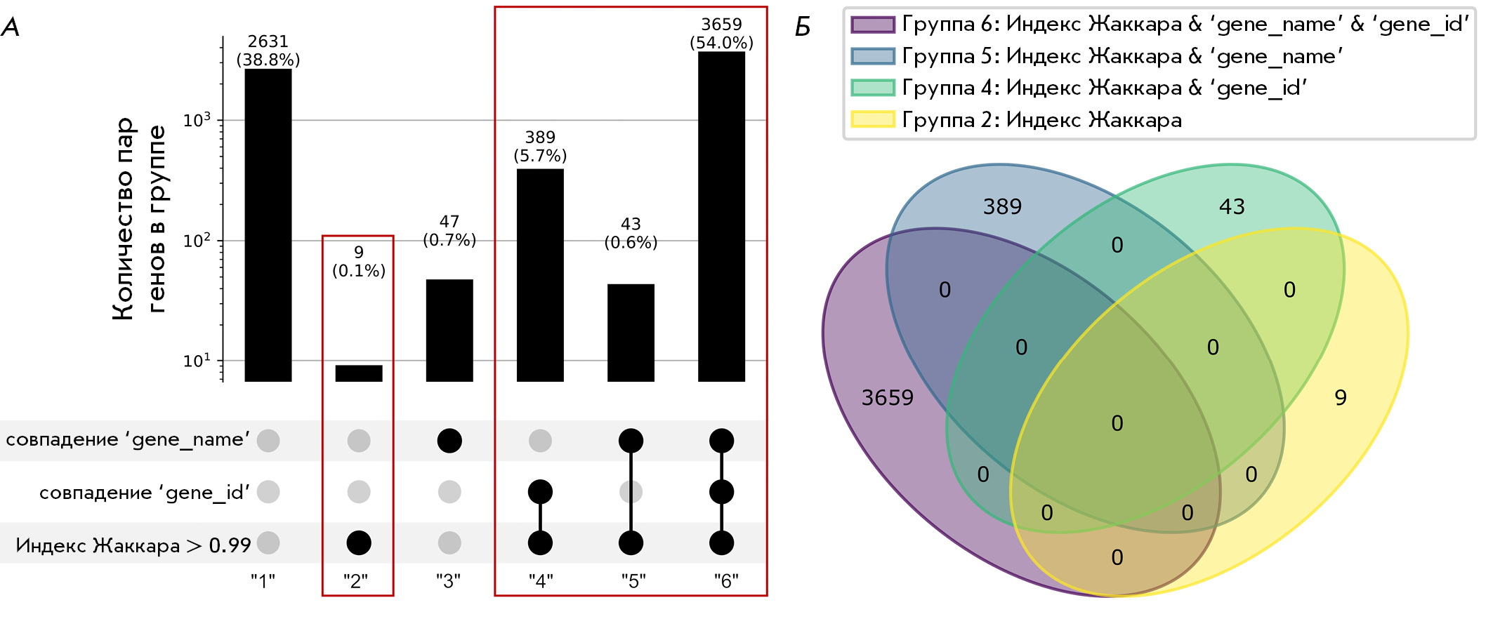 Рис. 1. Пересечение 4145 генов из HiMoRNA с 60619 генами из RNA-Chrom. А – разделение пар генов на шесть групп в зависимости от показателей сходства, которым они удовлетворяют. Красными прямоугольниками выделены те группы, в которых достигнуто однозначное соответствие между генами. Б – диаграмма Венна между группами генов 2, 4, 5 и 6 (суммарное количество пар генов в четырех группах равно 4100)