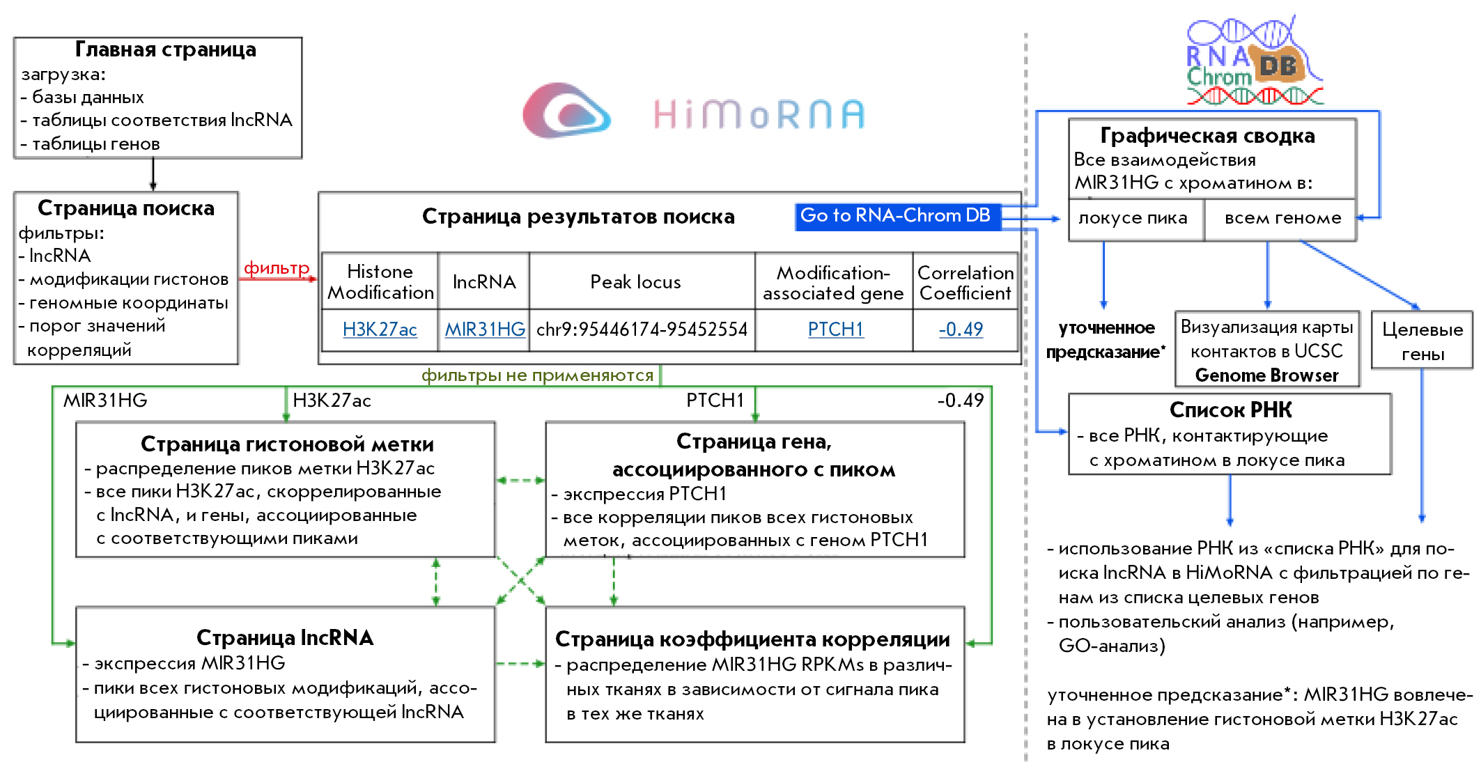 База данных HiMoRNA представляет собой коллекцию геномных локусов, в которых сигнал модификации гистонов значимо коррелирует с экспрессией lncRNA во многих типах клеток и тканей. В настоящее время она содержит более 5 млн корреляций для 10 типов модификаций гистонов и 4145 lncRNA. Предполагается, что некоторые из этих корреляций могут быть ложноположительными или соответствовать случаям непрямой регуляции, а следовательно, требуется дополнительная верификация с помощью внешних данных. RNA-Chrom – это база данных, содержащая полногеномные данные о взаимодействиях РНК с хроматином. К сожалению, эти данные почти не содержат контакты низкоэкспрессирующихся нкРНК и перегружены контактами новосинтезированных транскриптов. Помимо этого, сами по себе они не позволяют генерировать гипотезы, объясняющие функциональную роль взаимодействия. Имея это в виду, разумно интегрировать данные, содержащиеся в HiMoRNA и RNA-Chrom, чтобы охарактеризовать влияние lncRNA на эпигенетические модификации и экспрессию генов.