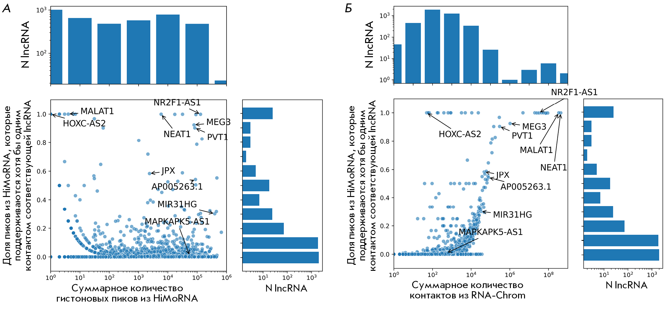 Ранее мы разработали базу данных HiMoRNA [13], которая содержит более 5 млн эпигенетических «пиков» – геномных регионов, в которых наблюдается одна из 10 модификаций гистоновых белков, причем уровень модификации значимо коррелирует с экспрессией одной из длинных некодирующих РНК не менее чем в 20 клеточных линиях и тканях. Пики гистоновых меток, представленных HiMoRNA, там, где это возможно, ассоциированы с генами, образуя триады «lncRNA–пик эпигенетической модификации–ассоциированный ген». Предполагается, что lncRNA в триаде потенциально может регулировать соответствующий ген посредством влияния на установление (1) или удаление (2) модификации гистона в районе ассоциированного с геном пика. В случае (1) пики будут положительно коррелировать с lncRNA («+» пики), а в случае (2) – отрицательно («–» пики). Таким образом, результаты, представленные в базе данных HiMoRNA, позволяют выдвигать предположения о роли lncRNA в установке или удалении эпигенетических модификаций в конкретных геномных локусах и, следовательно, в их влиянии на экспрессию генов. Однако для выдвижения разумных гипотез такого рода и их дальнейшей экспериментальной проверки, список из 5 млн пиков необходимо отфильтровать, выбрав наиболее надежные из них. Экспериментальные методы обнаружения взаимодействий РНК с хроматином позволяют получить ценные данные для этой цели.