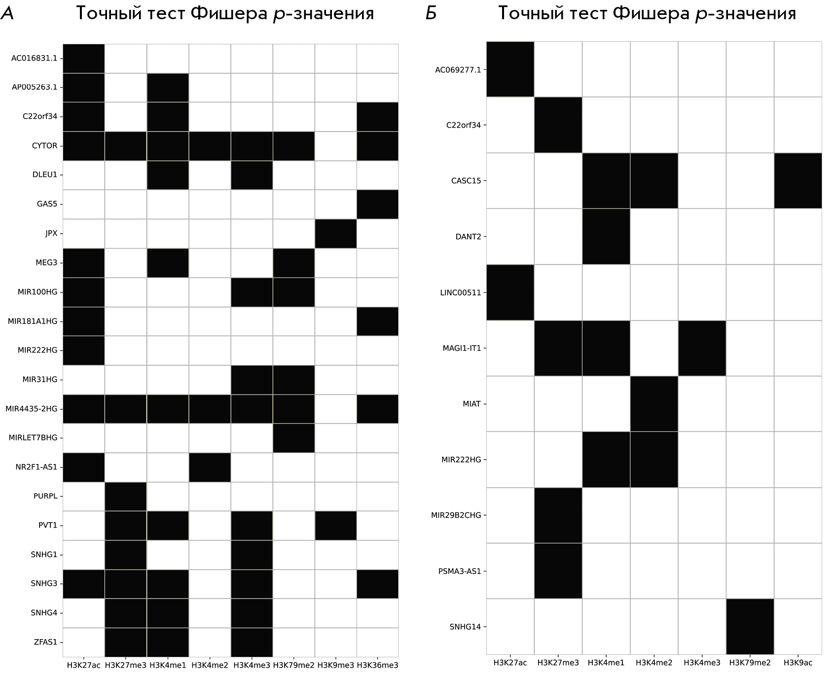 Рис. 4. Тепловая карта с результатами точного теста Фишера («Fisher exact test») для пар «lncRNA – расширенные на +/- 25 т.п.н. пики гистоновой метки». Черный цвет означает, что доля «-» / «+» гистоновых пиков, поддерживаемых контактами соответствующей lncRNA, больше 0.4 и p-value точного теста Фишера меньше 10-3, иначе – белый цвет. А – правосторонний тест Фишера («right-tailed»): «+» пики соответствующих гистоновых меток лучше поддерживаются контактами из RNA-Chrom, нежели «-» пики. Б – левосторонний тест Фишера («left-tailed»): «-» пики соответствующих гистоновых меток лучше поддерживаются контактами из RNA-Chrom, нежели «+» пики