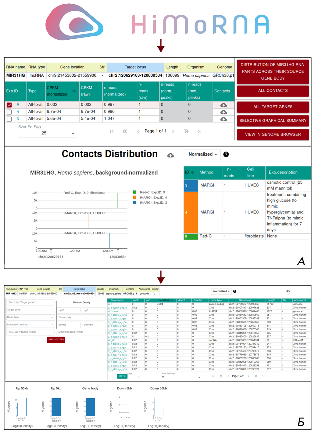 Чтобы улучшить и значительно облегчить функциональную аннотацию lncRNA, мы интегрировали базы данных HiMoRNA и RNA-Chrom. Для этого веб-интерфейс HiMoRNA и RNA-Chrom был модифицирован таким образом, чтобы обеспечить прямой доступ к контактам 4124 из 4145 lncRNA из HiMoRNA с хроматином в RNA-Chrom. Наш подход позволяет генерировать гипотезы относительно механизмов эпигенетической регуляции экспрессии генов человека длинными некодирующими РНК, подкрепленные экспериментальными данными о взаимодействиях соответствующих РНК c хроматином. Мы считаем, что эта интеграция является удобным и ценным ресурсом, который поможет определять надежные триады «lncRNA–эпигенетическая модификация–ассоциированный с модификацией ген» для их экспериментальной проверки. База данных HiMoRNA доступна пользователям по адресу https://himorna.fbras.ru (по состоянию на 20.10.2024).
