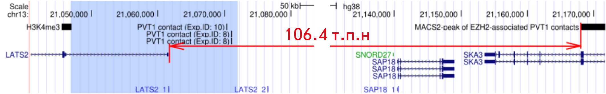 Рис. 7. Представление в UCSC Genome Browser в области гена LATS2 и его промоторной окрестности пика H3K4me3, скоррелированного с экспрессией lncRNA PVT1, контакты lncRNA PVT1 из двух экспериментов (RNA-Chrom Exp.ID: 8, 10) и пик EZH2-опосредованных контактов PVT1. Синяя область отражает расширение координат пика H3K4me3 на 25 т.п.н., в пределах которых были отобраны контакты из RNA-Chrom