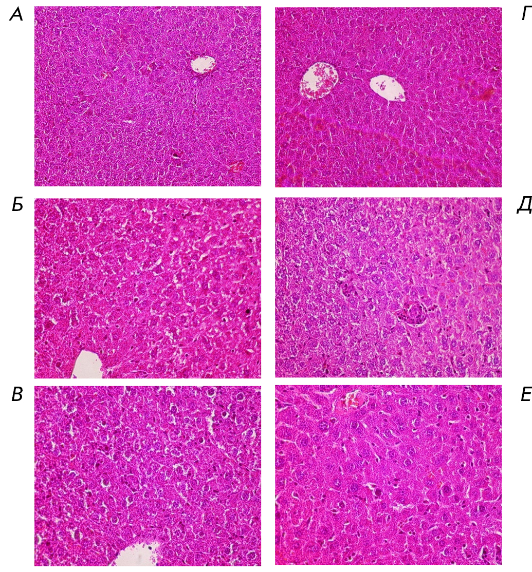 Liver tissues were fixed in 10% neutral formalin in a phosphate buffer (pH 7.2), followed by embedding in Histomix paraffin. Histological specimens were prepared using standard histological methods. To assess the overall morphological picture in the experiment, sections were stained with hematoxylin and eosin. Evaluation and photographing were performed using an Olympus microscope (Japan) with the Imeg pro+ software package (free version).