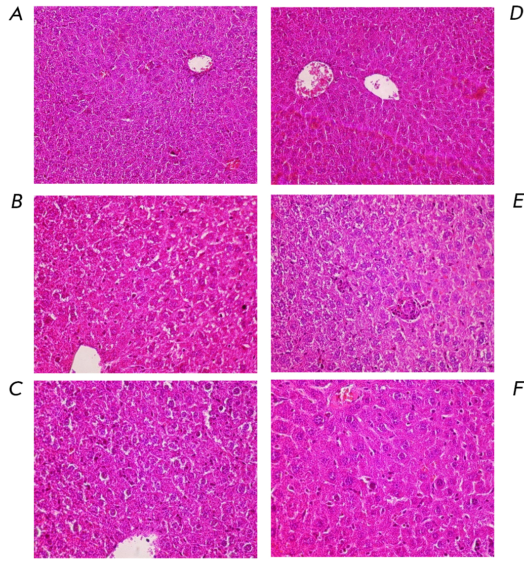 Fig. 2. The structure of the liver of the mice in the control groups ((A) corn oil; (D) bacterial culture medium), under the influence of PCB 1 (B), PCB 2 (C), PCB 1 biodegradation products (E), and PCB 2 biodegradation products (F) by the strain Rhodococcus sp. FG1. Magnification: ×400. Hematoxylin and eosin staining