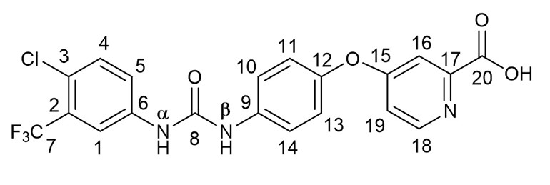 4-(4-(3-(4-chloro-3-(trifluoromethyl)phenyl)ureido)phenoxy)picolinic acid (SRF-A). 0.67 g (12 mmol) of KOH was dissolved in 12 mL of a THF–MeOH–H2O (1 : 1 : 1) mixture, and 2.32 g (5 mmol) of SRF-ME was added with stirring in two equal parts over 10 min, and, after dissolution of the starting compound, the mixture was left to rest at room temperature for 1 h. The reaction mixture was diluted with 12 mL of H2O and neutralized with HCl (1 : 1) to pH ≈ 1.5. The precipitate was triturated, another 12 mL of H2O was added, and the mixture was cooled at 10°C for 1 h. The precipitate was filtered, washed with H2O, and air-dried to yield 2.20 g (97%) of SRF-A. 1H NMR (DMSO-d6): δ 9.29 (1H, s, NHα), 9.06 (1H, s, NHb), 8.58 (1H, d, J 5.7, H18), 8.13 (1H, d, J 2.4, H16), 7.70–7.56 (4H, m, H4, H10 and H14, H19), 7.44 (1H, d, J 2.5 H1), 7.24–7.13 (3H, m, H5, H11 and H13). 13C NMR (DMSO-d6): δ 166.47 (C20), 165.85 (C15), 152.96 (C8), 151.19 (C18), 150.86 (C17), 148.20 (C12), 139.81 (C9), 137.65 (C6), 132.44 (C4 or C5), 127.21 (q, J 30.5, C2), 123.54 (C4 or C5), 123.28 (q, J 273, C7), 122.83 (C3), 121.84 (C10 and C14), 120.99 (C11 and C13), 117.30 (q, J 5.5, C1), 115.12 (C19), 112.32 (C16). 19F NMR (DMSO-d6): δ ‒61.46 (CF3).